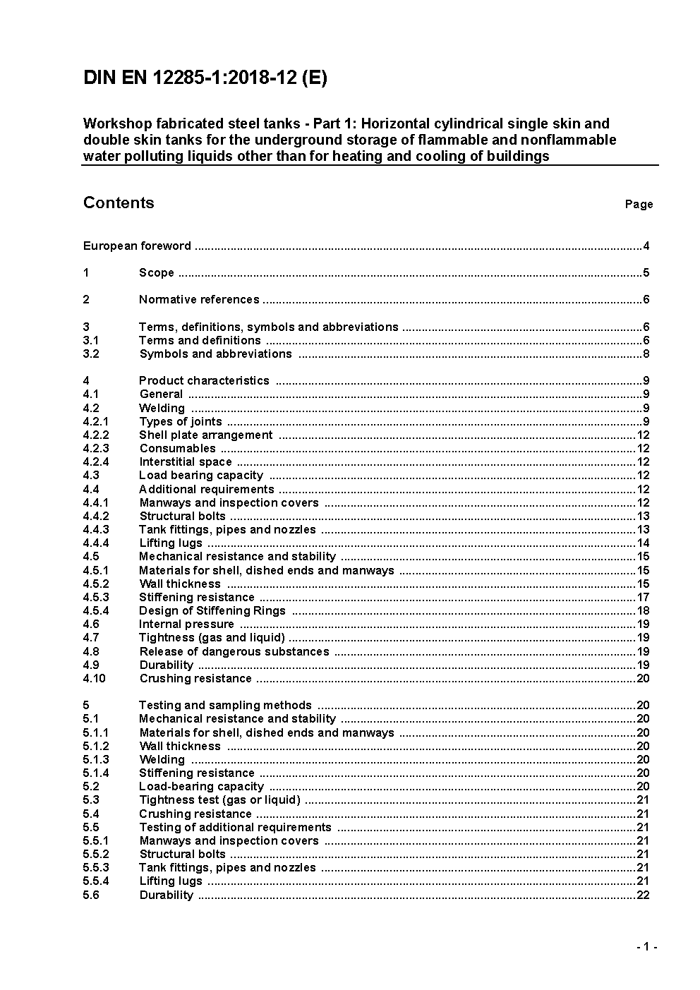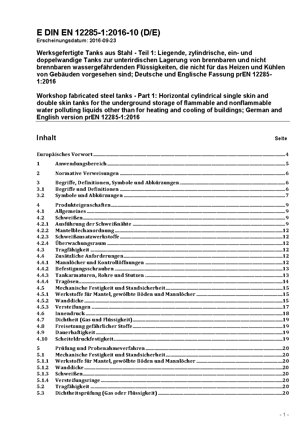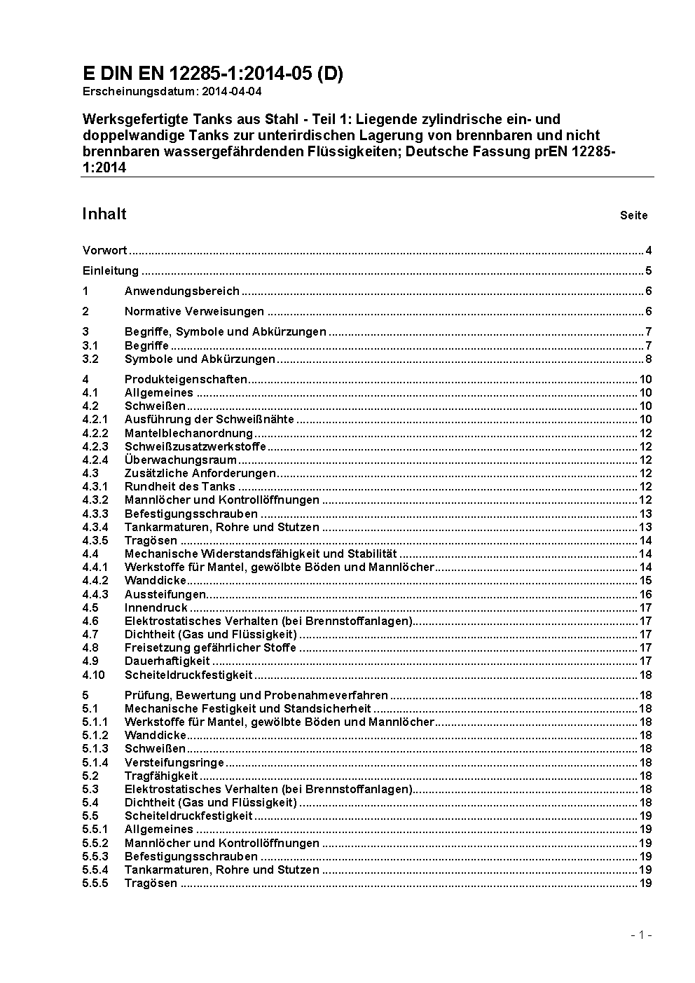 Werksgefertigte Tanks aus Stahl - Teil 1: Liegende zylindrische ein- und doppelwandige Tanks zur unterirdischen Lagerung von brennbaren und nichtbrennbaren wassergefährdenden Flüssigkeiten; Deutsche Fassung EN 12285-1:2003