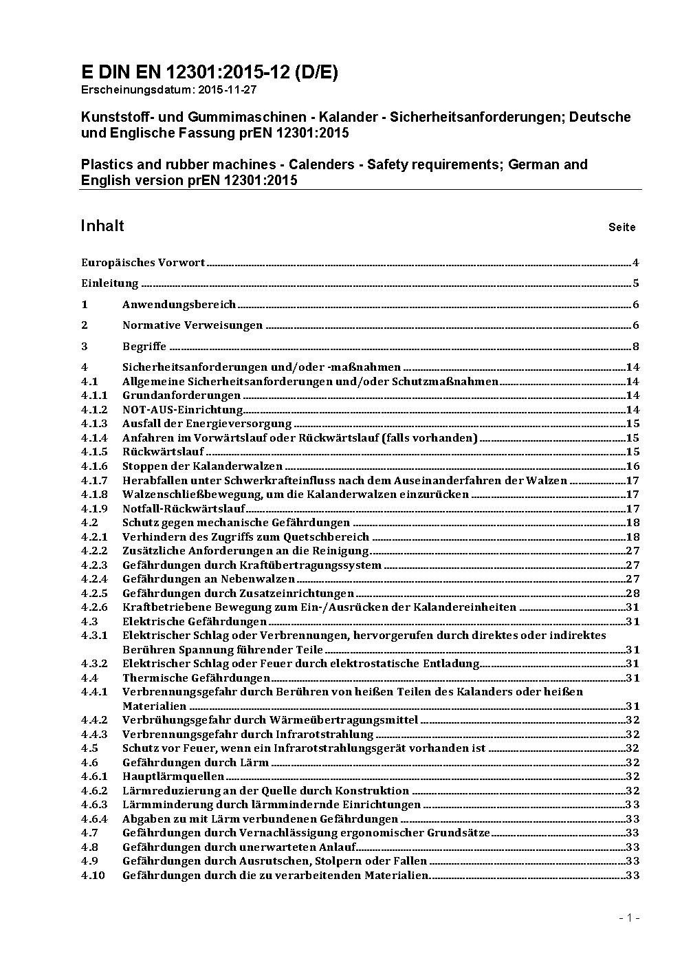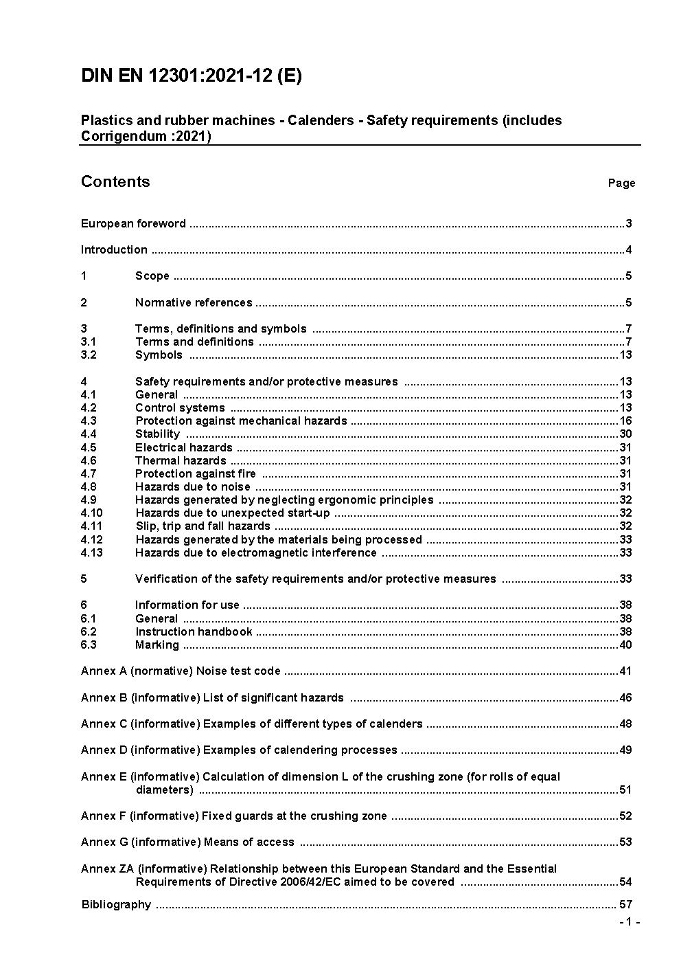 Plastics and rubber machines - Calenders - Safety requirements; German version EN 12301:2000+A1:2008
