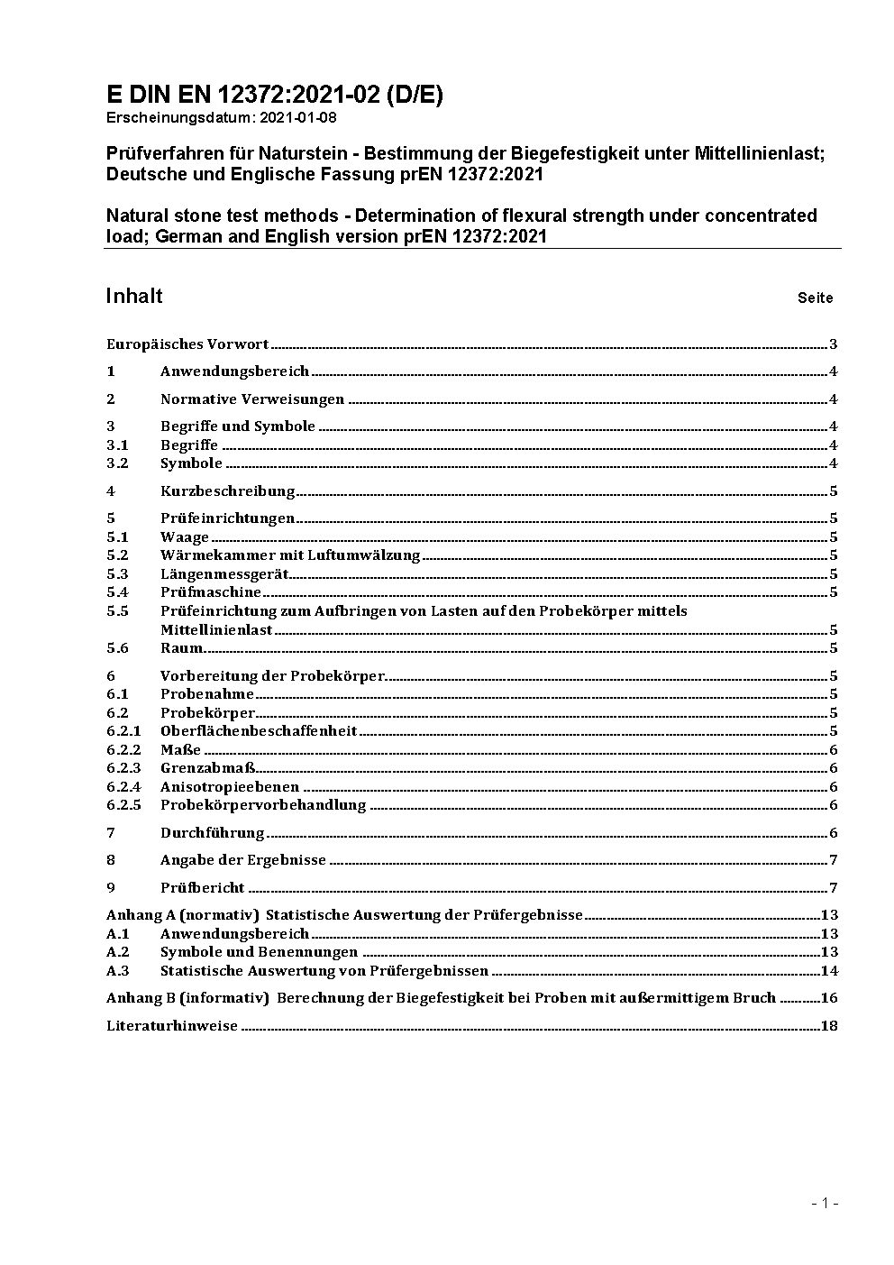 Prüfverfahren für Naturstein - Bestimmung der Biegefestigkeit unter Mittellinienlast; Deutsche Fassung EN 12372:2006