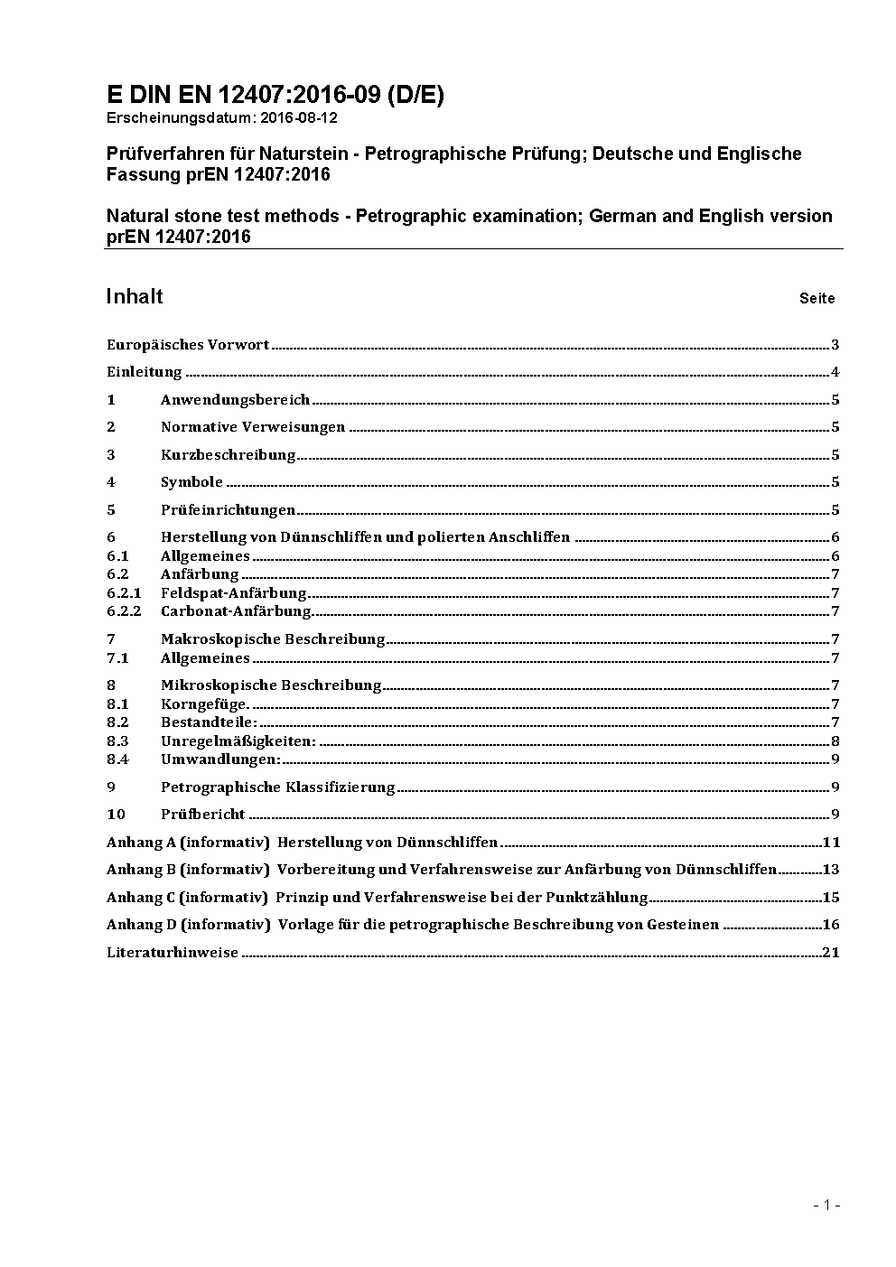 Prüfverfahren für Naturstein - Petrographische Prüfung; Deutsche und Englische Fassung prEN 12407:2016