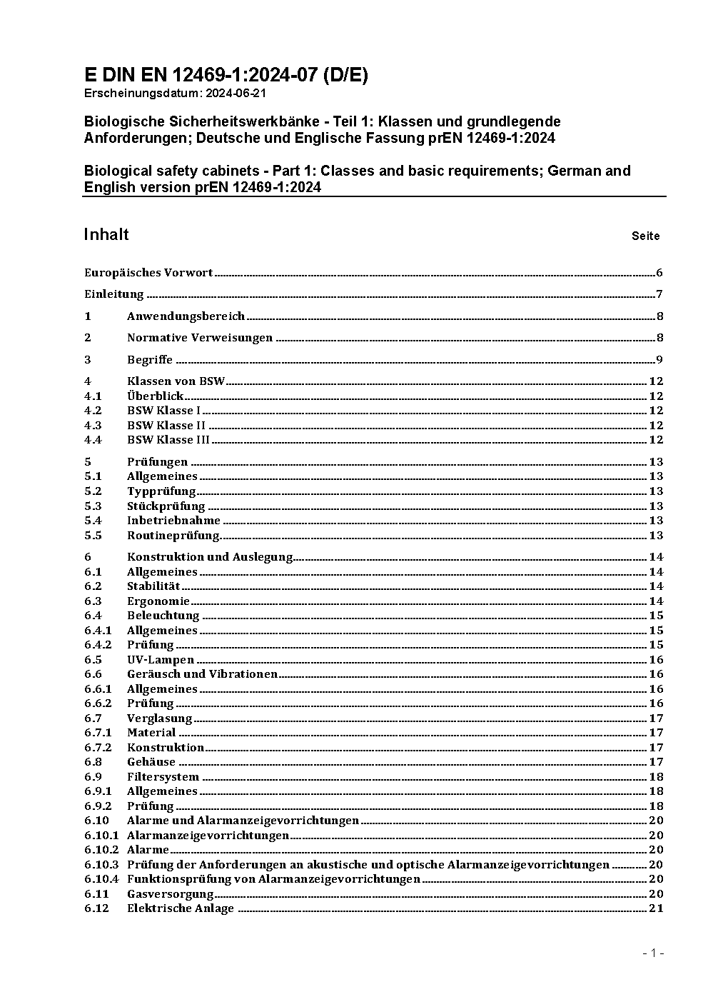 Biologische Sicherheitswerkbänke - Teil 1: Klassen und grundlegende Anforderungen; Deutsche und Englische Fassung prEN 12469-1:2024