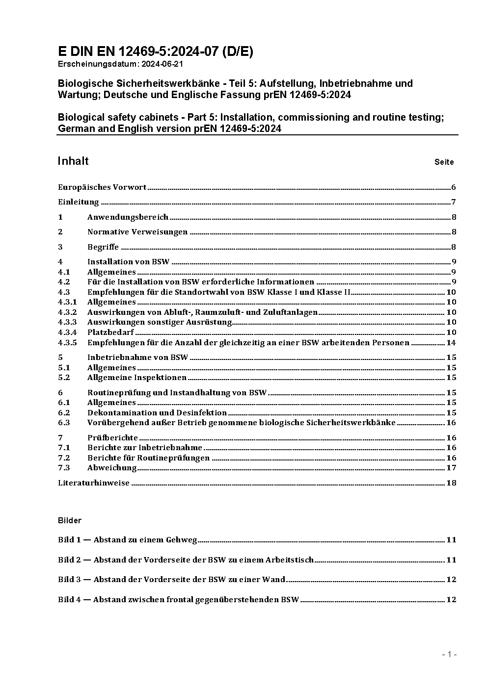 Biologische Sicherheitswerkbänke - Teil 5: Aufstellung, Inbetriebnahme und Wartung; Deutsche und Englische Fassung prEN 12469-5:2024