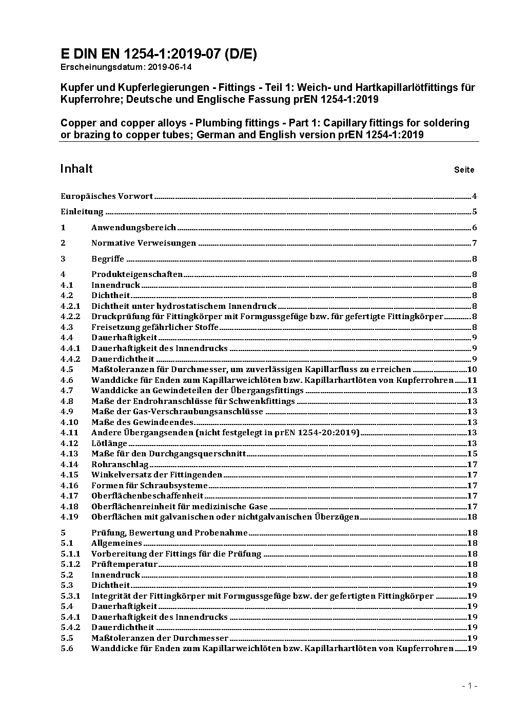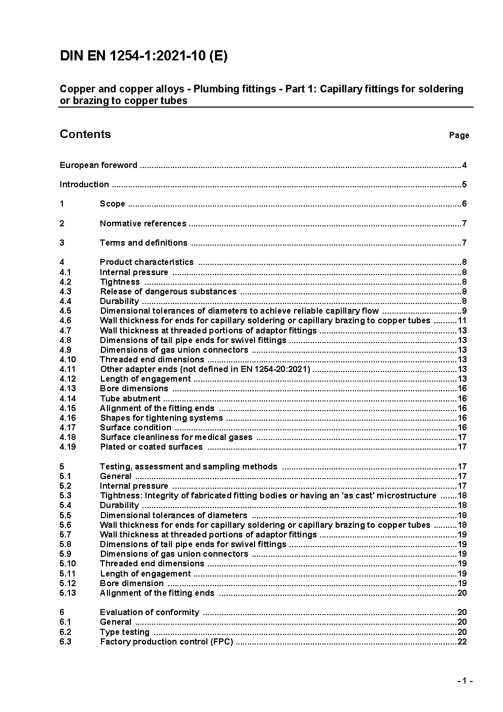 Copper and copper alloys - Plumbing fittings - Part 1: Capillary fittings for soldering or brazing to copper tubes; German version EN 1254-1:2021