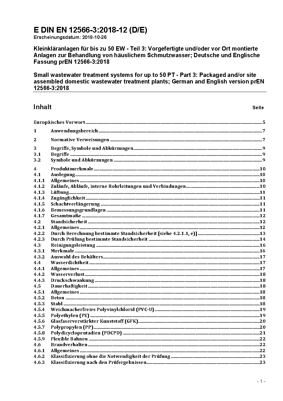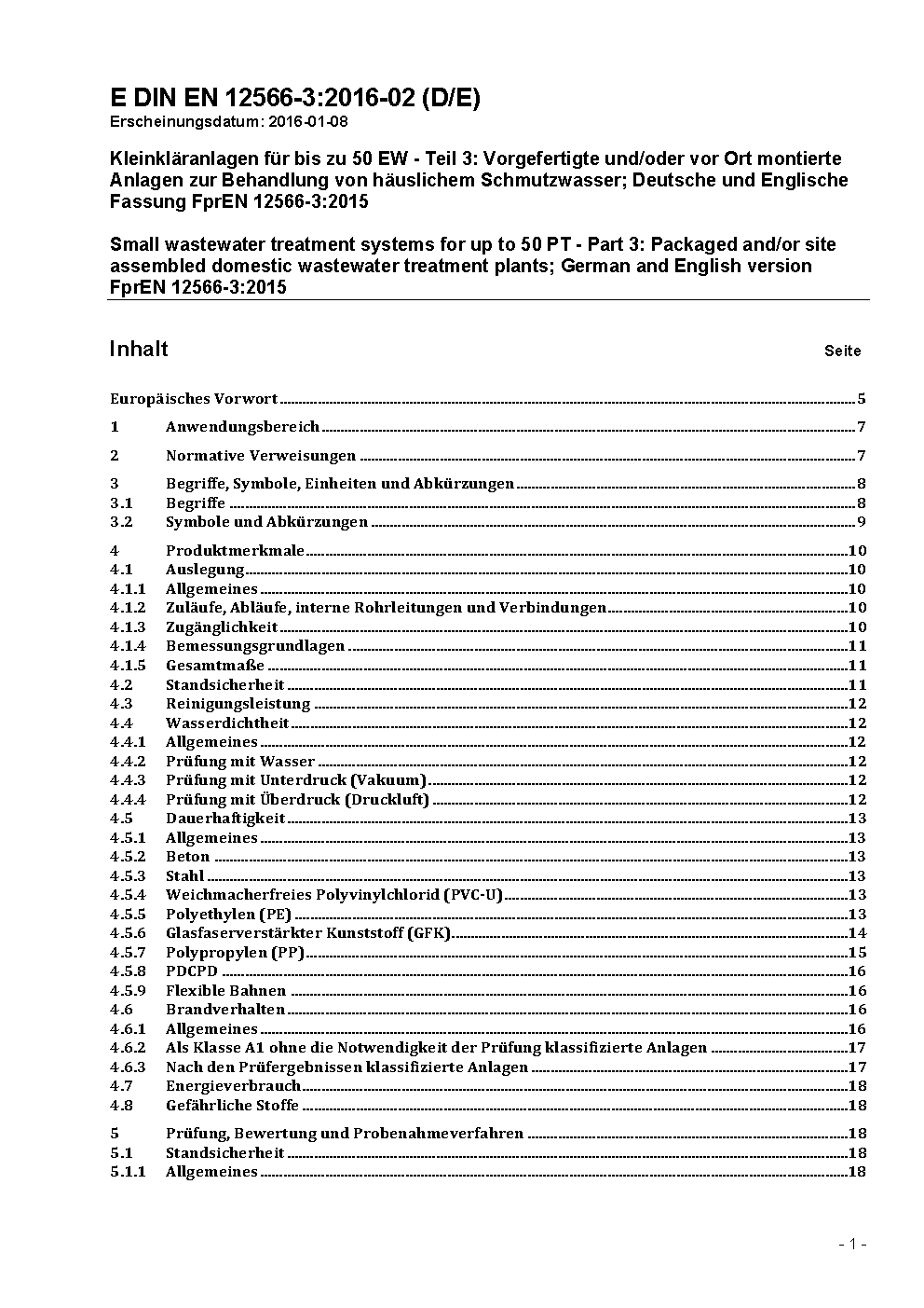 Kleinkläranlagen für bis zu 50 EW - Teil 3: Vorgefertigte und/oder vor Ort montierte Anlagen zur Behandlung von häuslichem Schmutzwasser; Deutsche Fassung EN 12566-3:2016