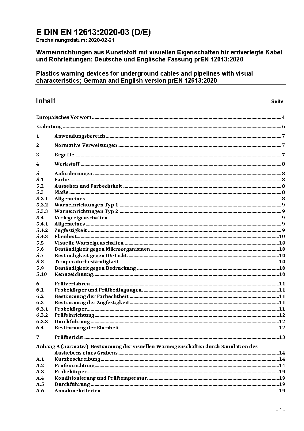 Warneinrichtung aus Kunststoff mit visuellen Eigenschaften für erdverlegte Kabel und Rohrleitungen; Deutsche Fassung EN 12613:2001