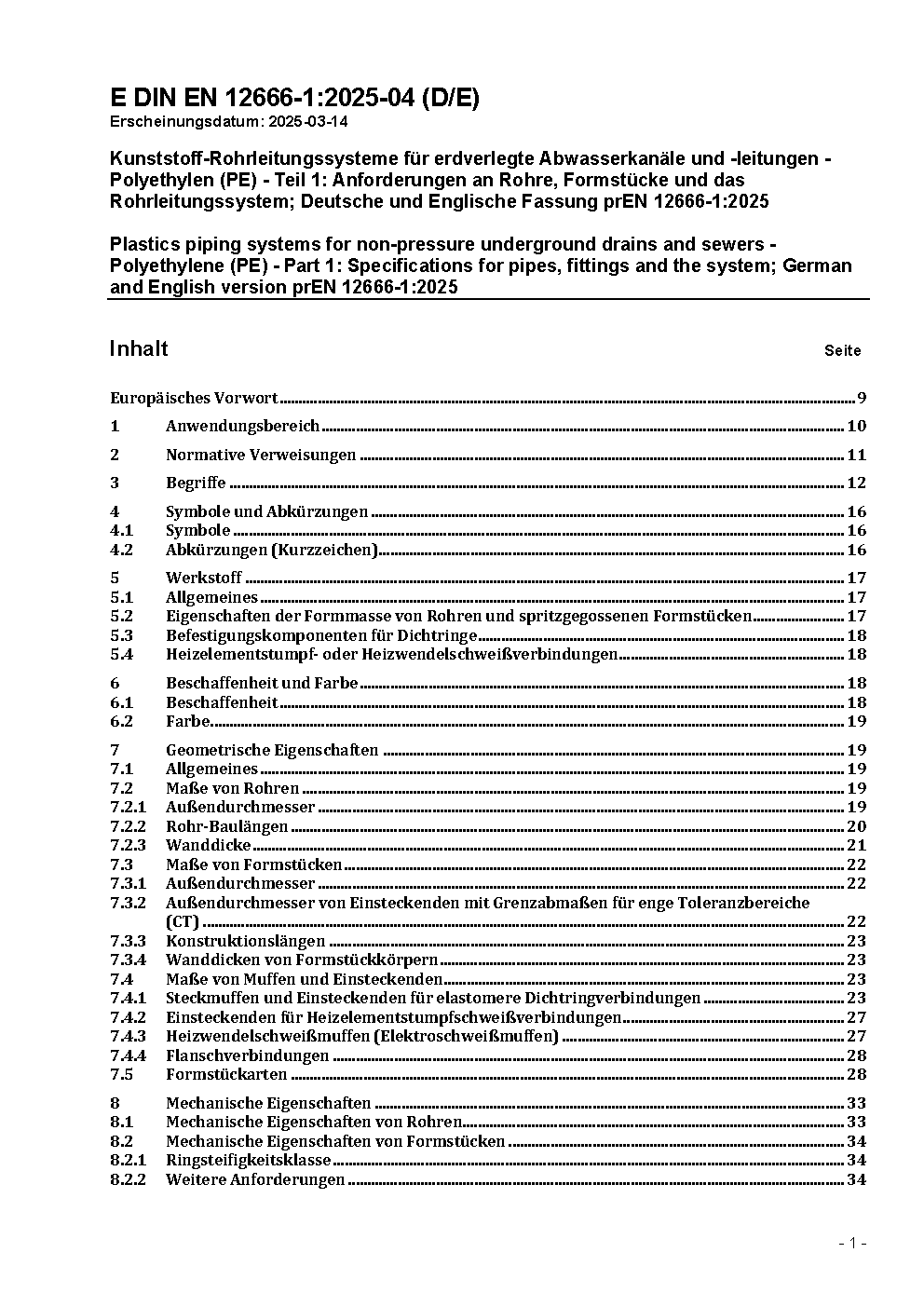 Kunststoff-Rohrleitungssysteme für erdverlegte Abwasserkanäle und -leitungen - Polyethylen (PE) - Teil 1: Anforderungen an Rohre, Formstücke und das Rohrleitungssystem; Deutsche Fassung EN 12666-1:2005 / Achtung: Daneben gelten DIN 19537-1 (1983-10) und DIN 19537-2 (1988-01) noch bis 2008-06-01.