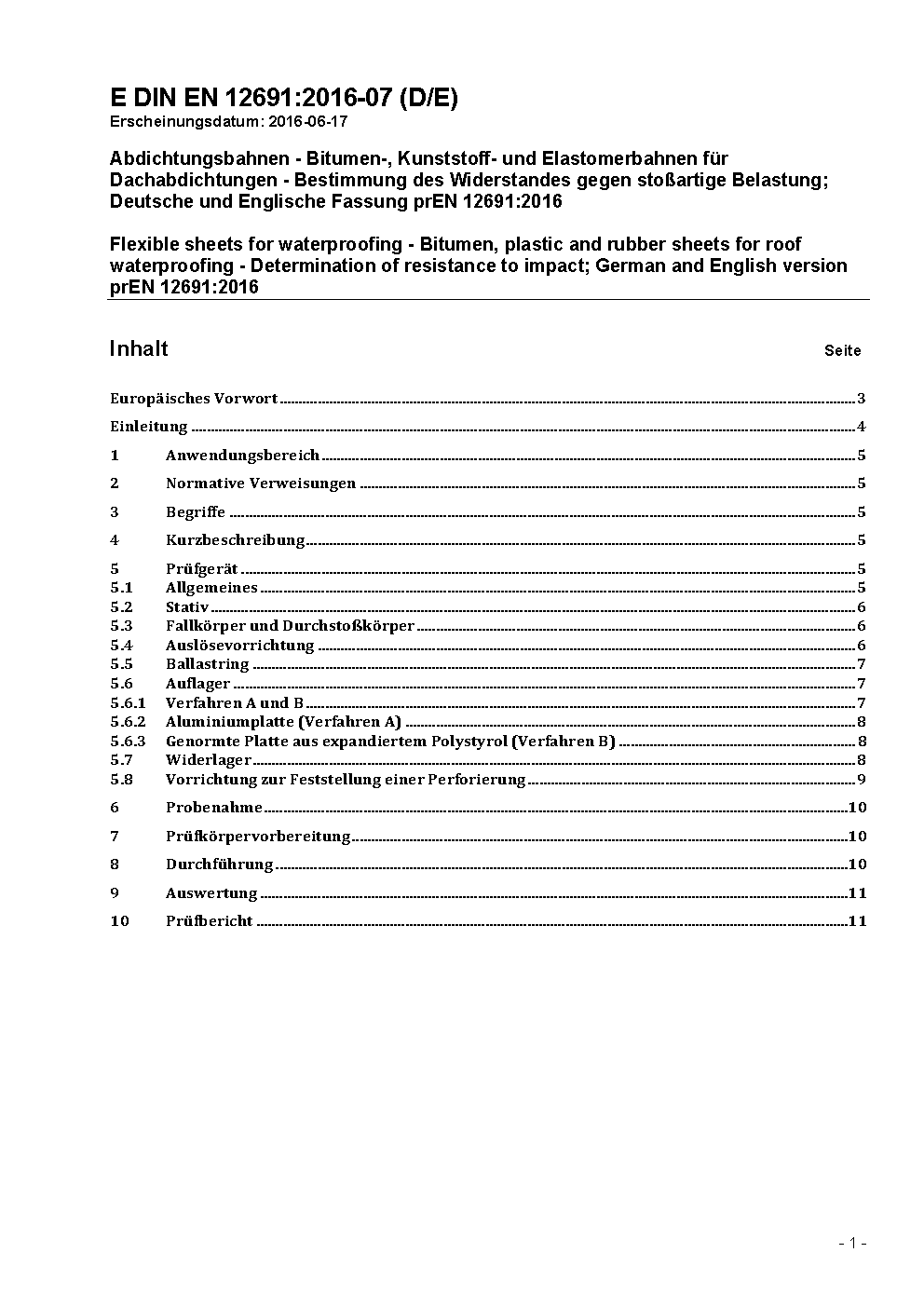 Abdichtungsbahnen - Bitumen-, Kunststoff- und Elastomerbahnen für Dachabdichtungen - Bestimmung des Widerstandes gegen stoßartige Belastung; Deutsche Fassung EN 12691:2018