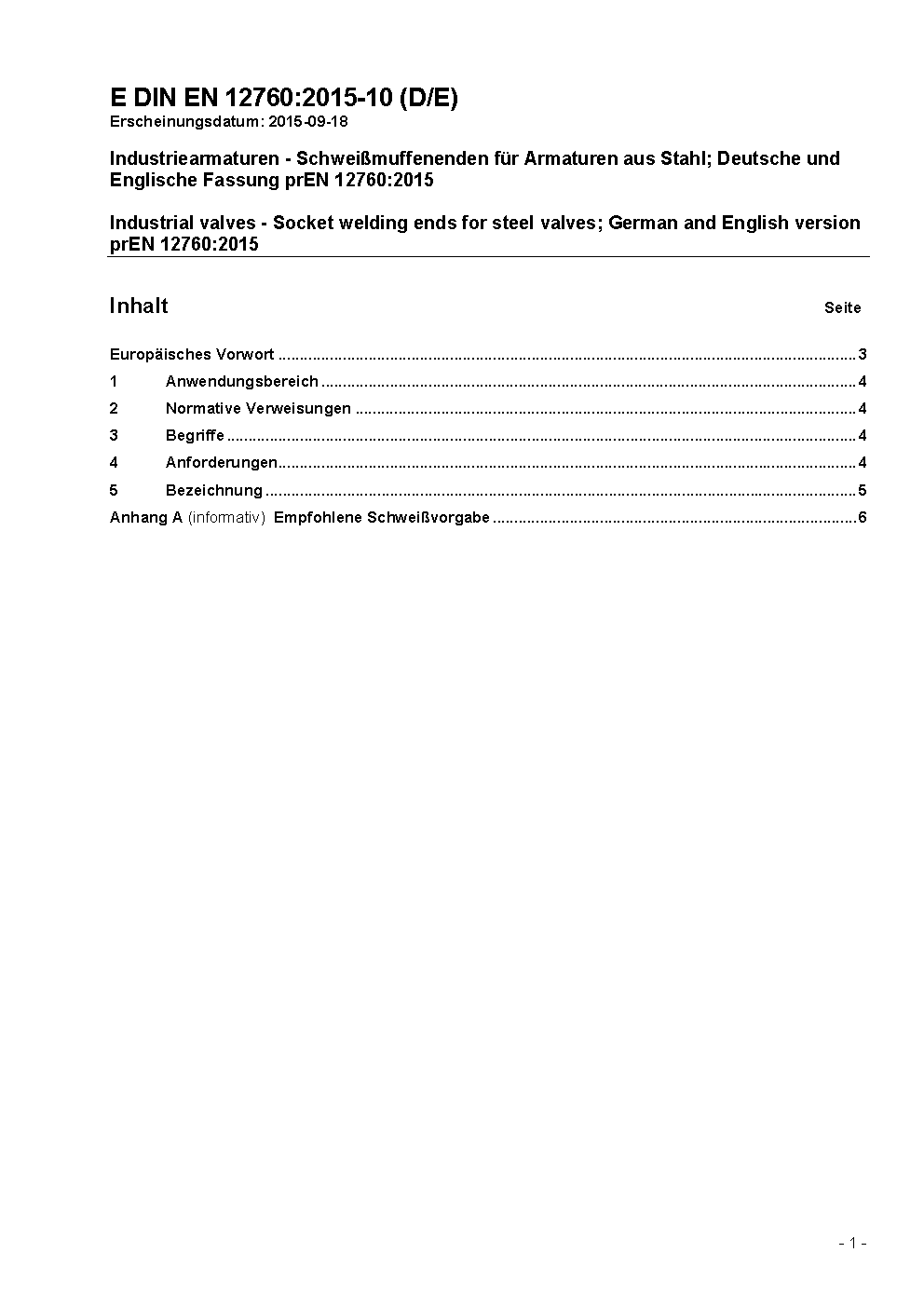 Armaturen - Schweißmuffenenden für Armaturen aus Stahl; Deutsche Fassung EN 12760:1999