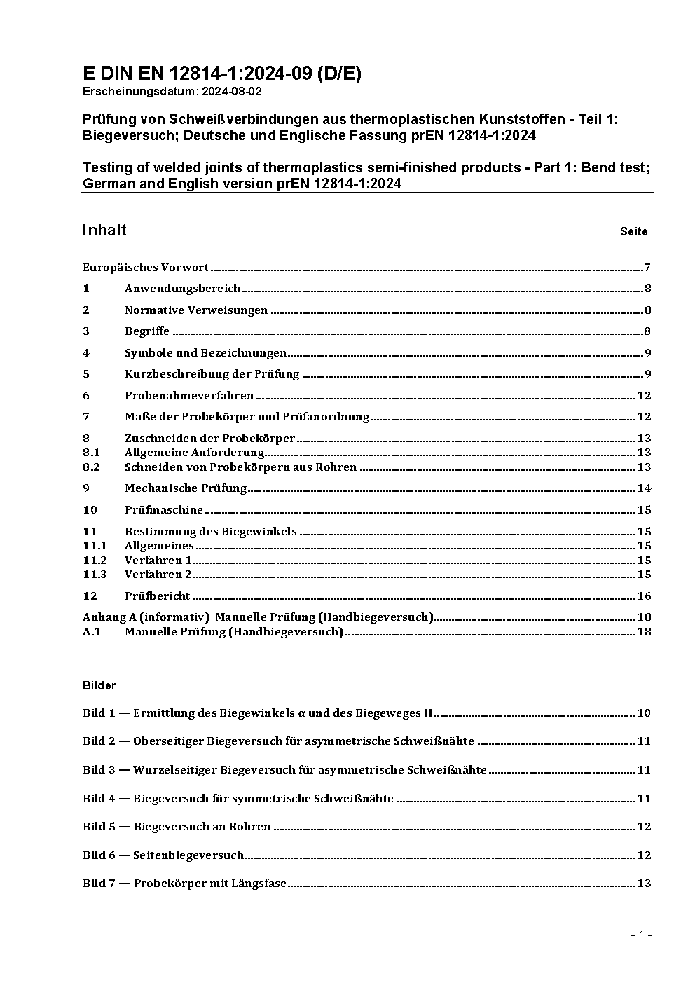 Prüfung von Schweißverbindungen aus thermoplastischen Kunststoffen - Teil 1: Biegeversuch; Deutsche Fassung EN 12814-1:1999