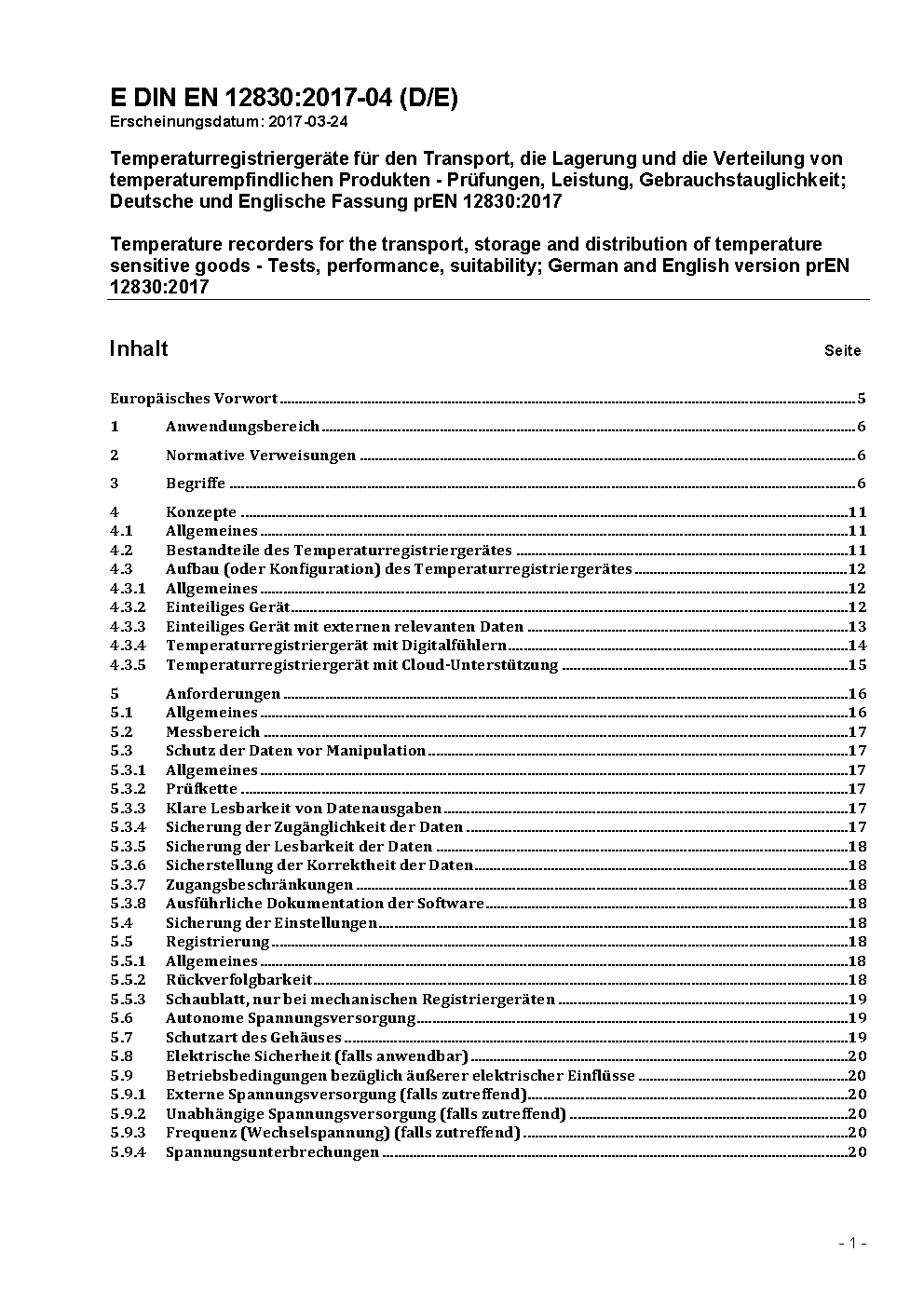 Temperaturregistriergeräte für den Transport, die Lagerung und die Verteilung von temperaturempfindlichen Produkten - Prüfungen, Leistung, Gebrauchstauglichkeit; Deutsche und Englische Fassung prEN 12830:2017