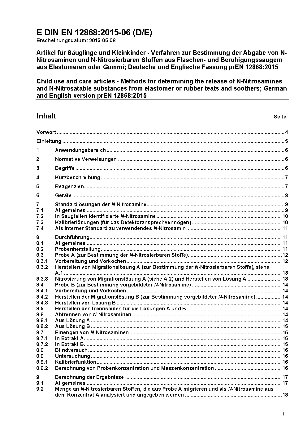 Artikel für Säuglinge und Kleinkinder - Verfahren zur Bestimmung der Abgabe von N-Nitrosaminen und N-Nitrosierbaren Stoffen aus Flaschen- und Beruhigungssaugern aus Elastomeren oder Gummi; Deutsche und Englische Fassung prEN 12868:2015