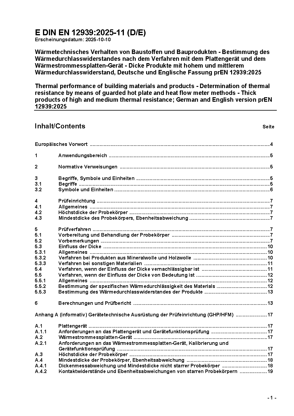 Thermal performance of building materials and products - Determination of thermal resistance by means of guarded hot plate and heat flow meter methods - Thick products of high and medium thermal resistance; German version EN 12939:2000