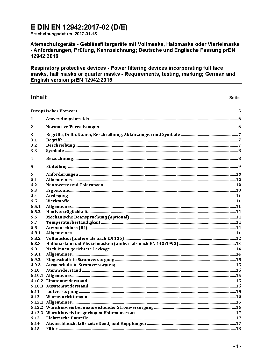 Atemschutzgeräte - Gebläsefiltergeräte mit Vollmaske, Halbmaske oder Viertelmaske - Anforderungen, Prüfung, Kennzeichnung; Deutsche und Englische Fassung prEN 12942:2016