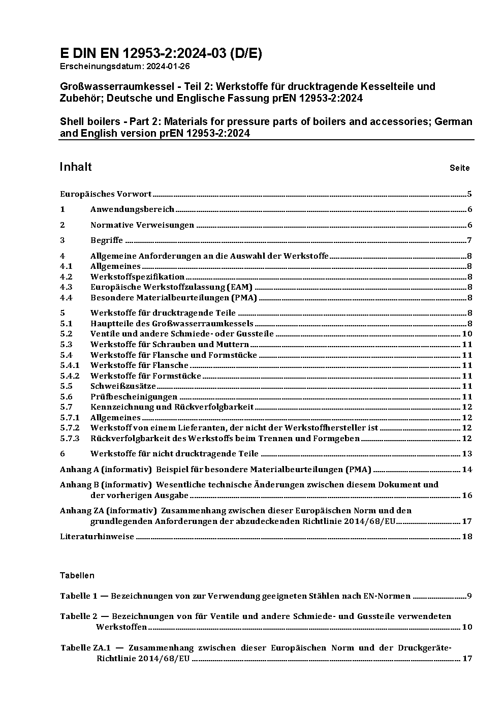 Großwasserraumkessel - Teil 2: Werkstoffe; Deutsche Fassung prEN 12953-2:1998