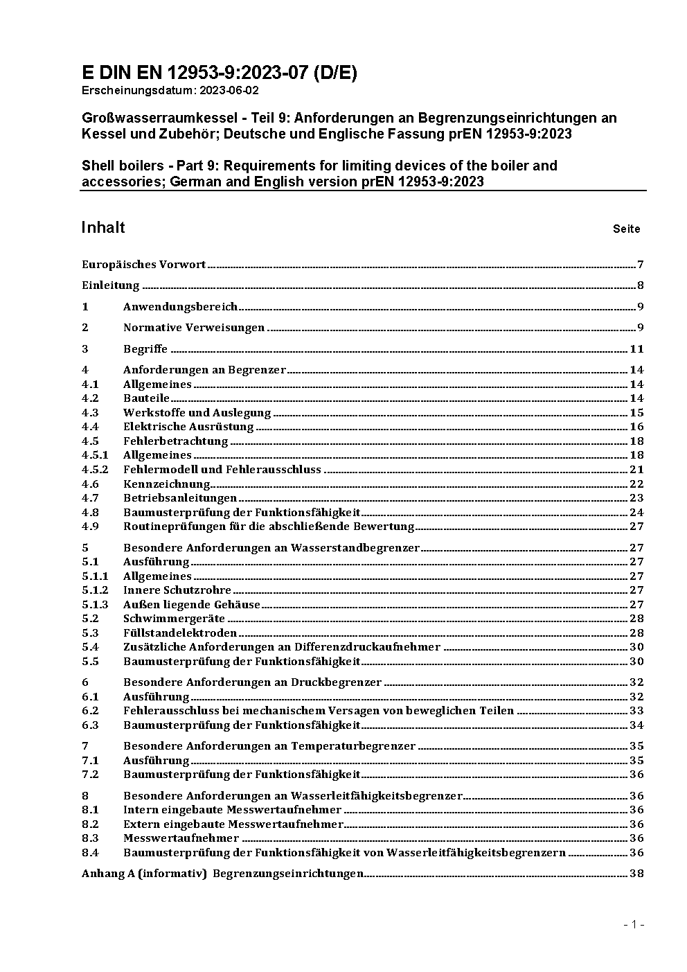 Großwasserraumkessel - Teil 9: Anforderungen an Begrenzungseinrichtungen an Kessel und Zubehör; Deutsche und Englische Fassung prEN 12953-9:2023