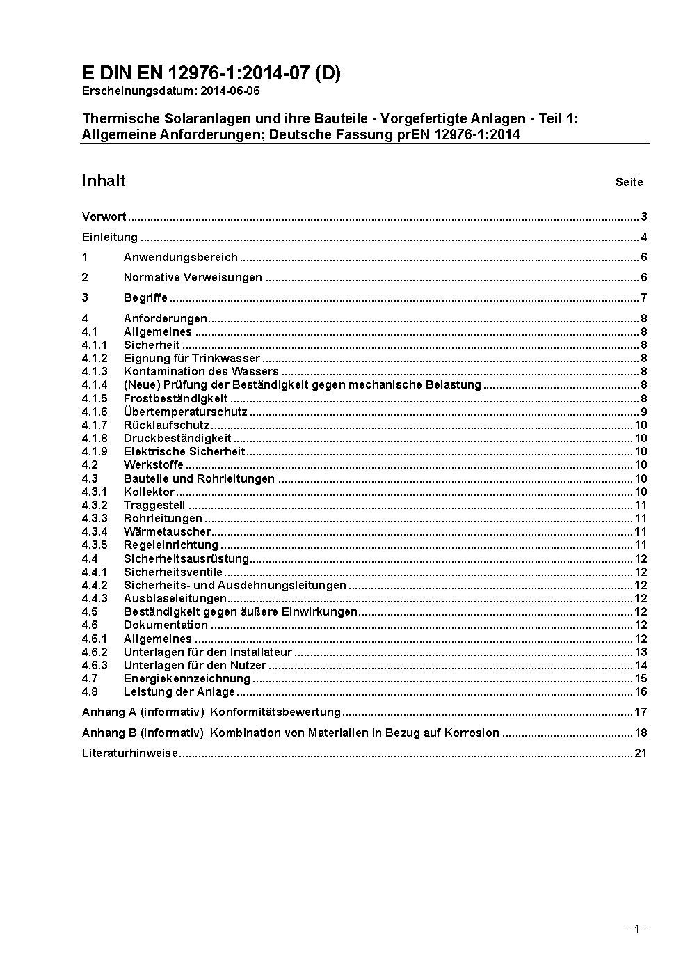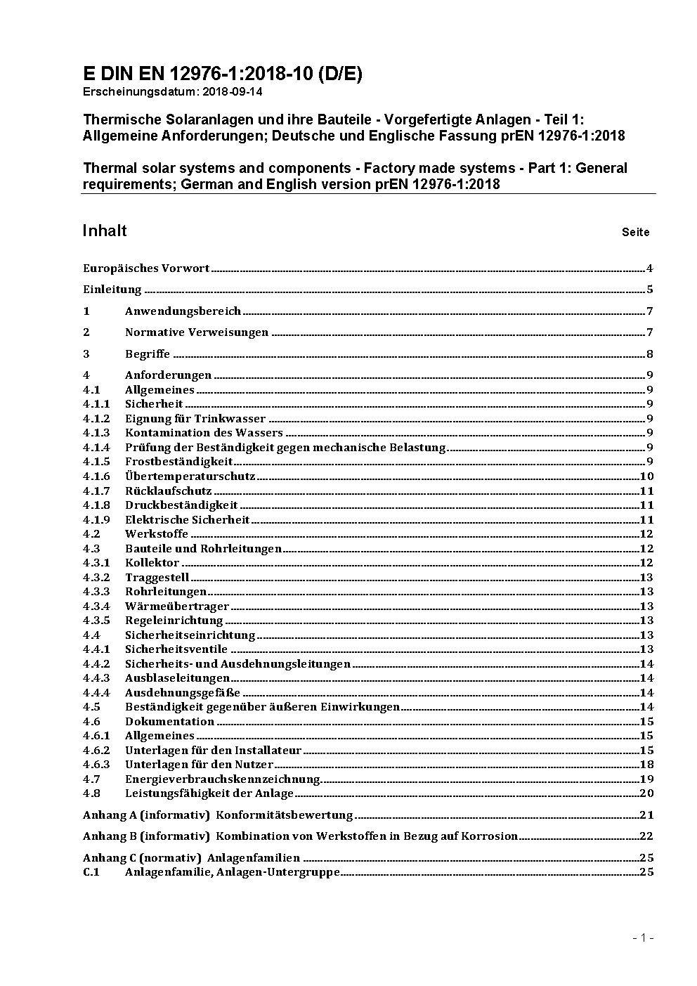 Thermische Solaranlagen und ihre Bauteile - Vorgefertigte Anlagen - Teil 1: Allgemeine Anforderungen; Deutsche Fassung prEN 12976-1:1997