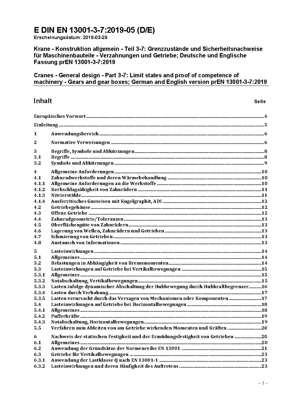 Krane - Konstruktion allgemein - Teil 3-7: Grenzzustände und Sicherheitsnachweise für Maschinenbauteile - Verzahnungen und Getriebe; Deutsche und Englische Fassung prEN 13001-3-7:2019