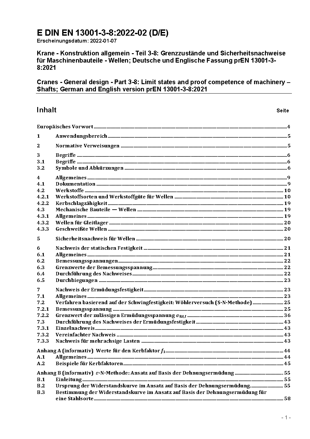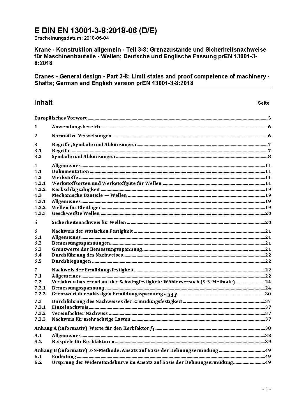 Krane - Konstruktion allgemein - Teil 3-8: Grenzzustände und Sicherheitsnachweise für Maschinenbauteile - Wellen; Deutsche und Englische Fassung prEN 13001-3-8:2018
