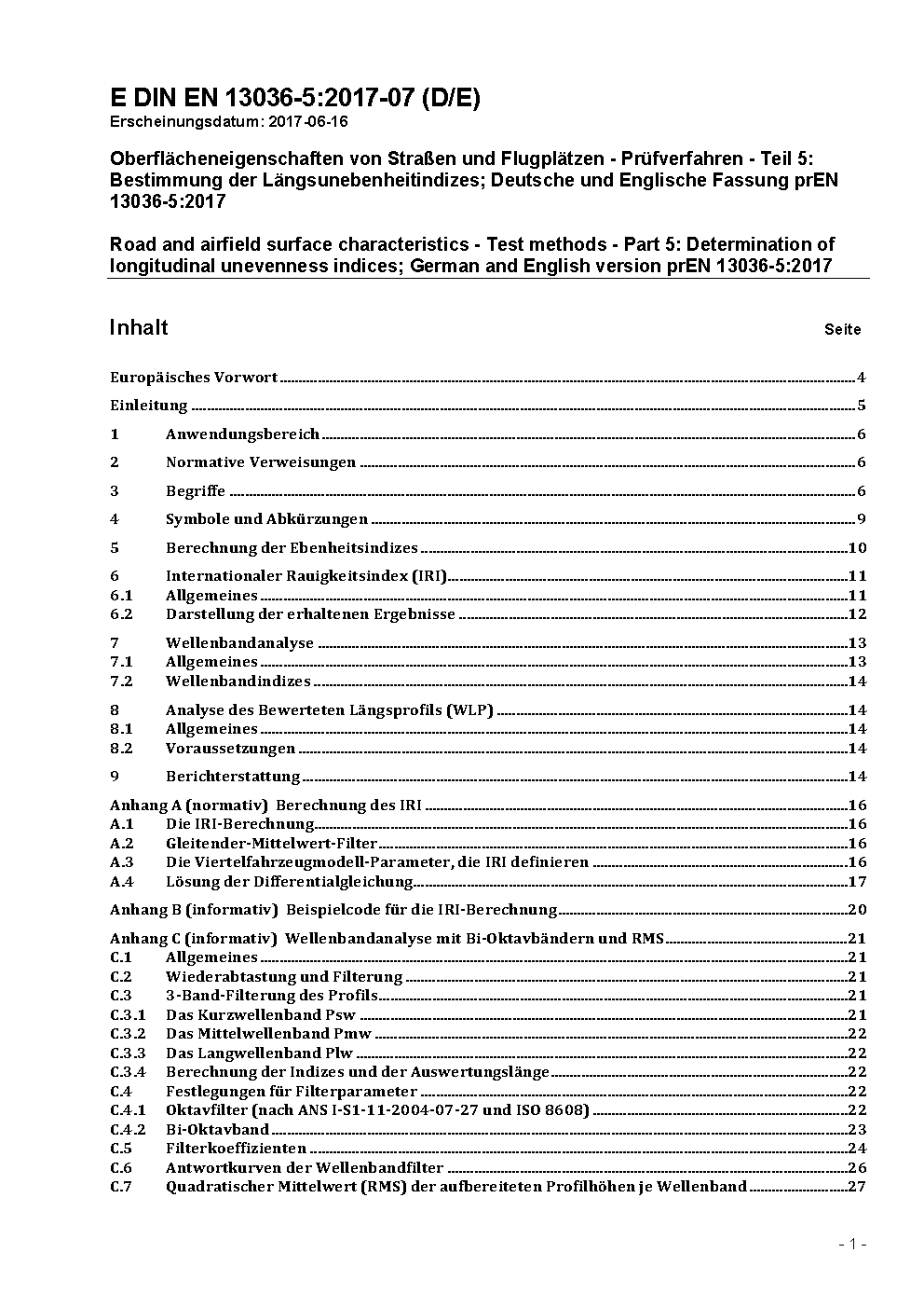 Road and airfield surface characteristics - Test methods - Part 5: Determination of longitudinal unevenness indices; German version prEN 13036-5:2006