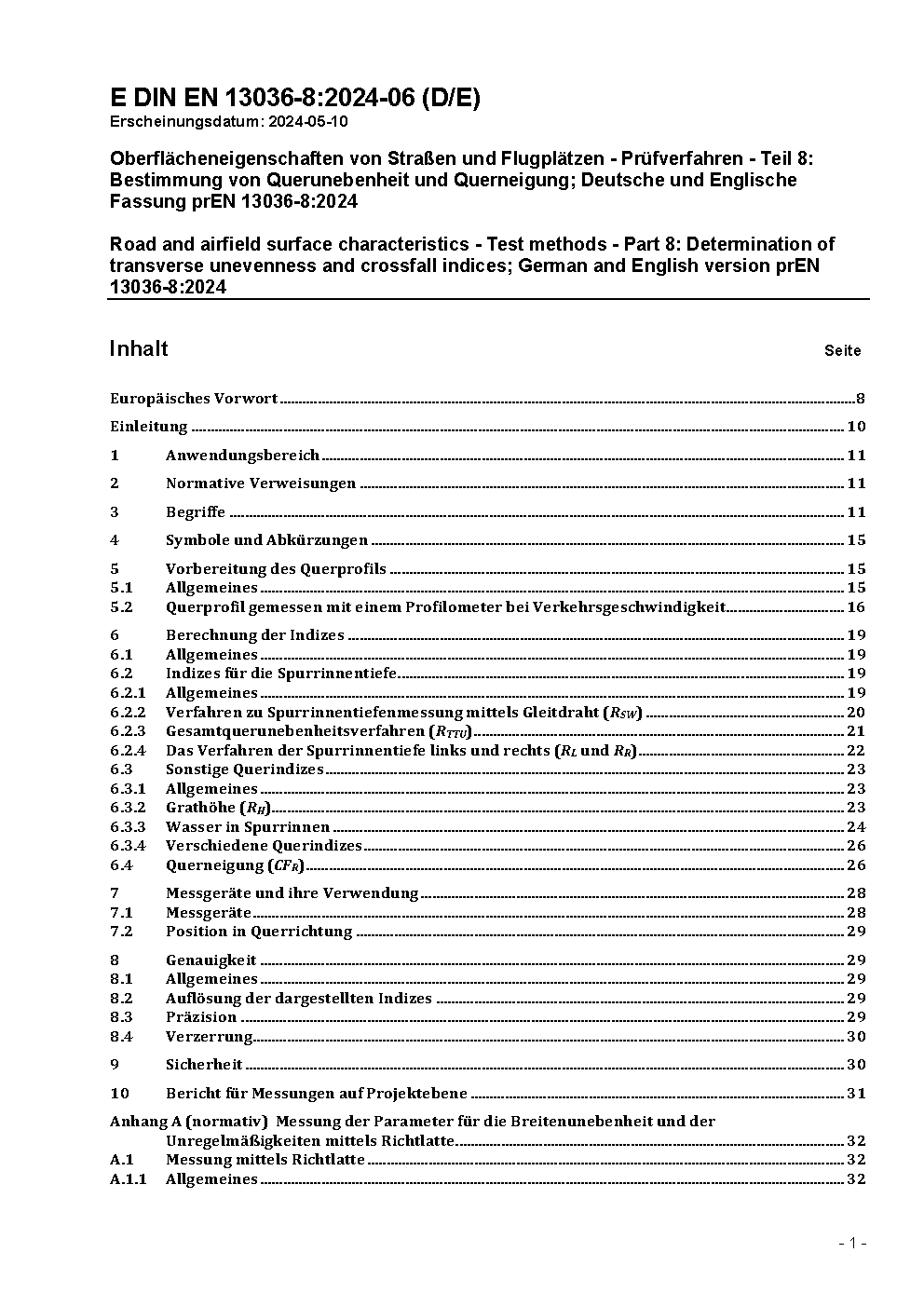 Road and airfield surface characteristics - Test methods - Part 8: Transverse unevenness and irregularities, definitions, methods of evaluation and reporting; German version prEN 13036-8:2006