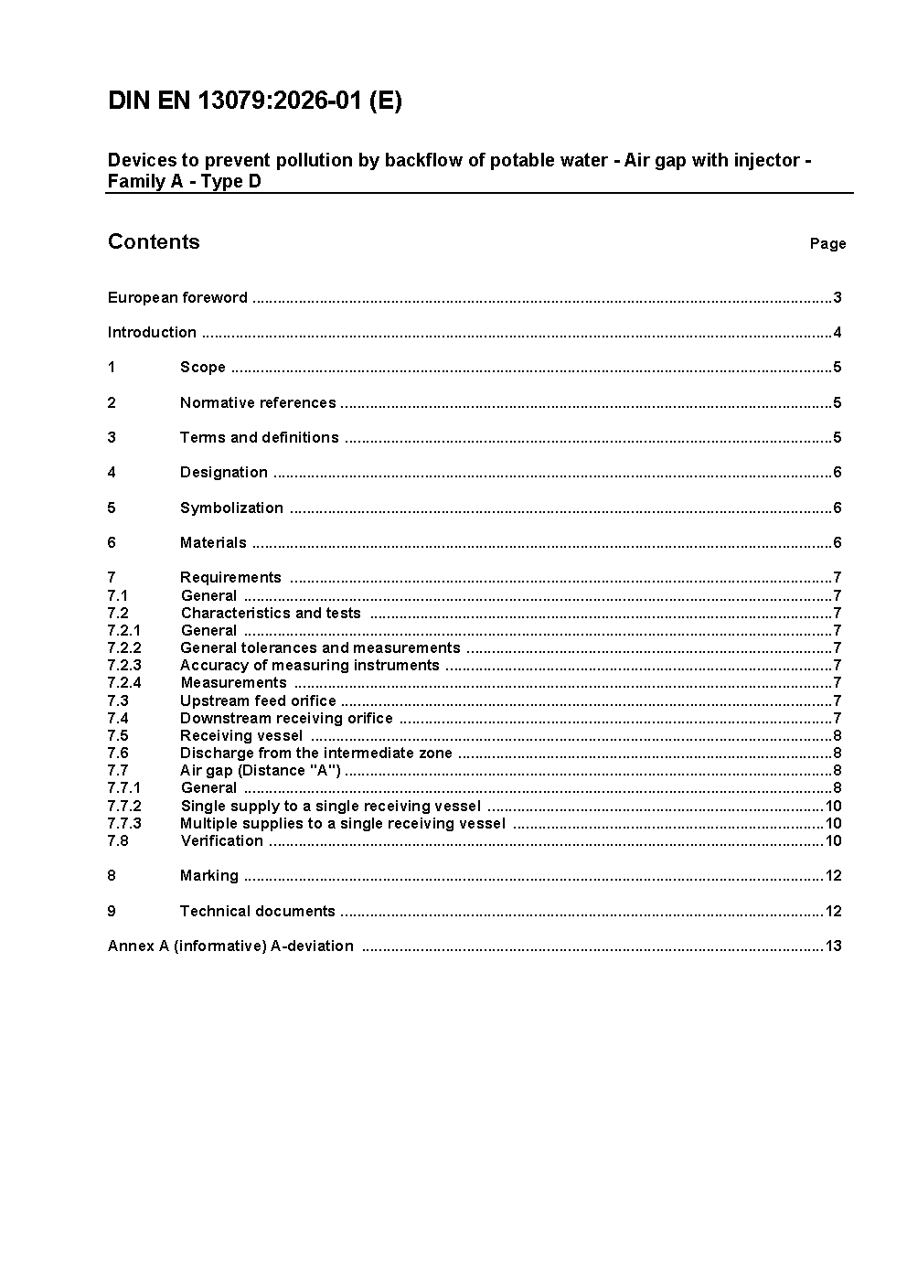 Devices to prevent pollution by backflow of potable water - Air gap with injector - Family A; Type D; German version EN 13079:2003