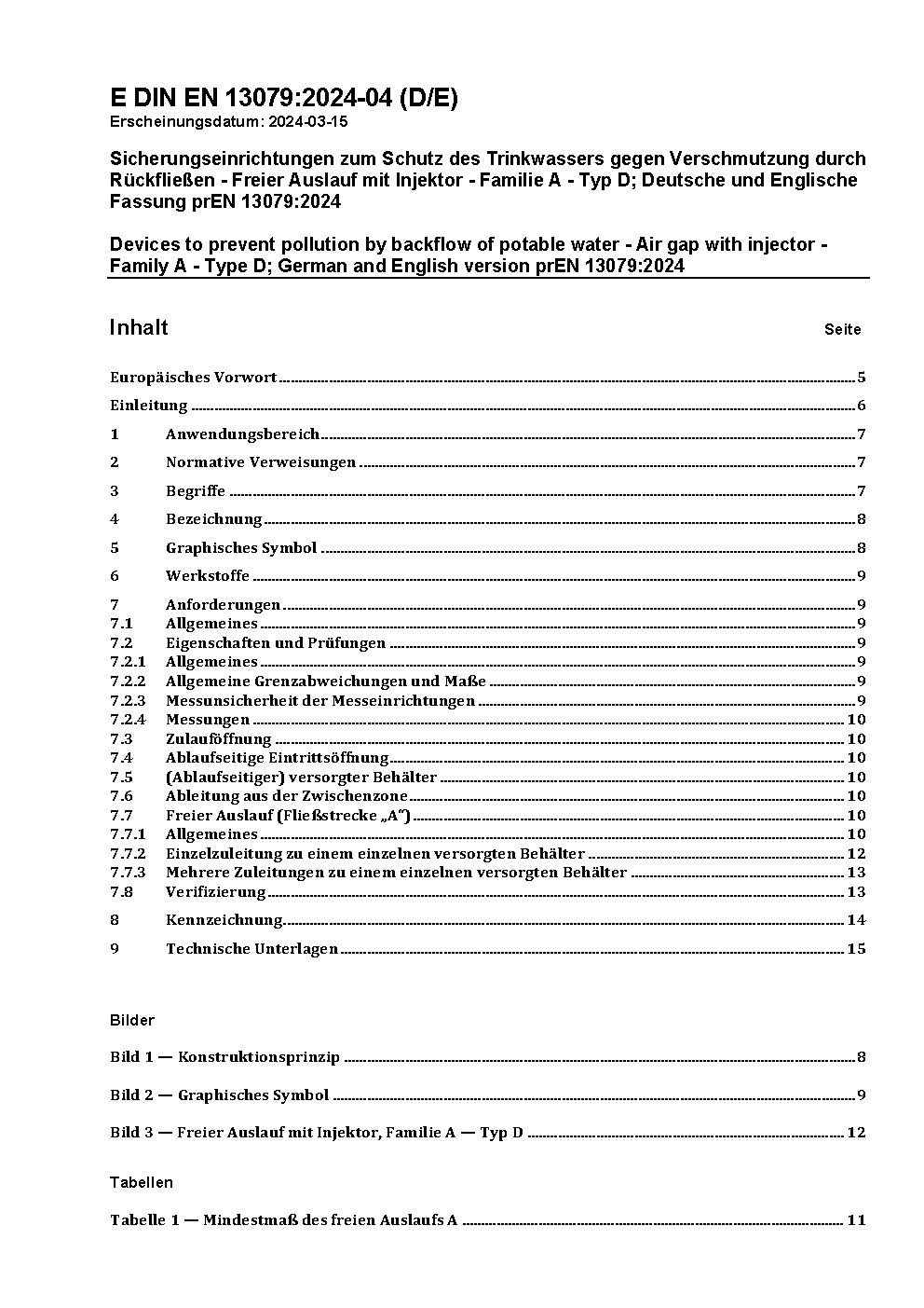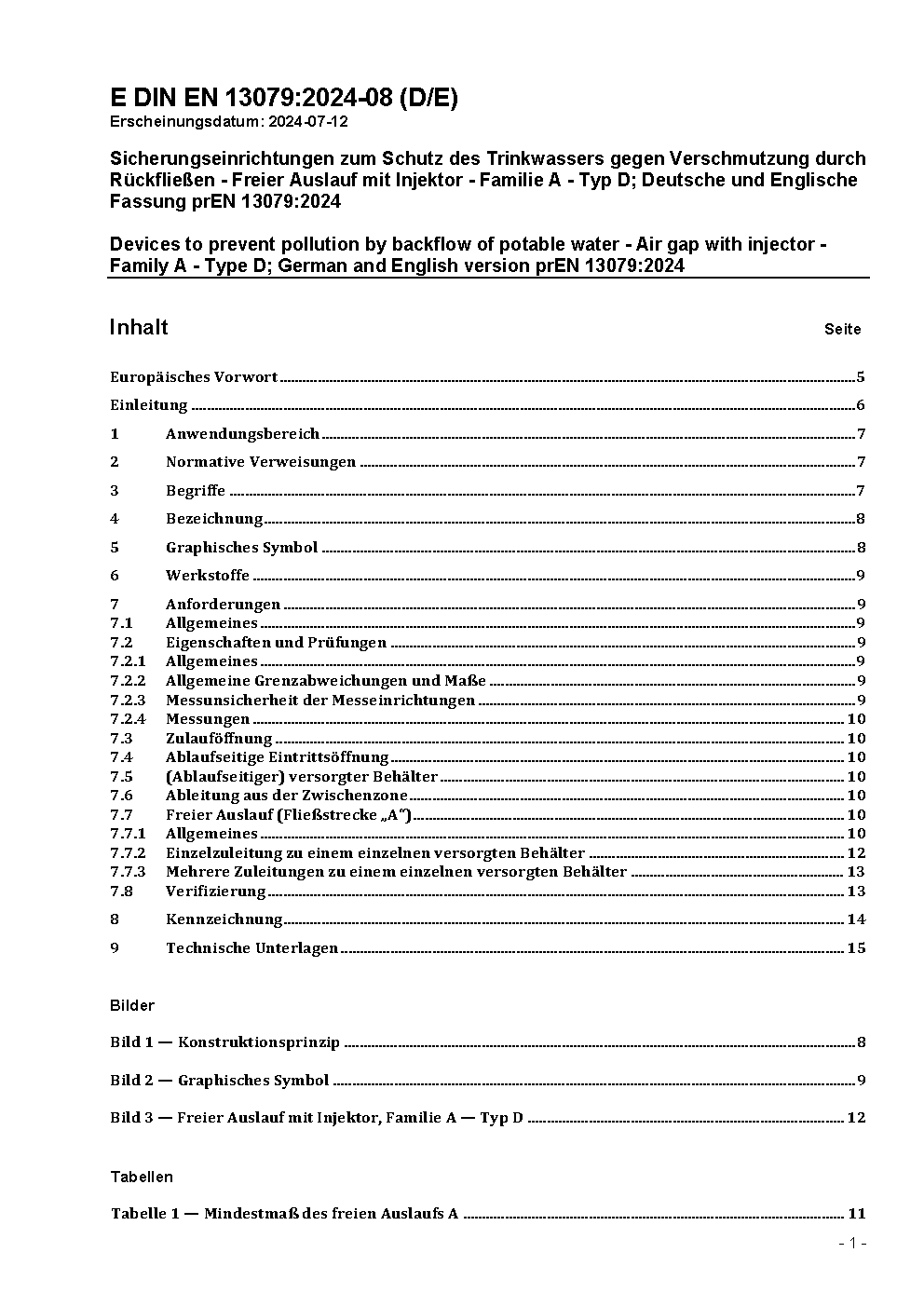 Sicherungseinrichtungen zum Schutz des Trinkwassers gegen Verschmutzung durch Rückfließen - Freier Auslauf mit Injektor - Familie A; Typ D; Deutsche Fassung EN 13079:2003