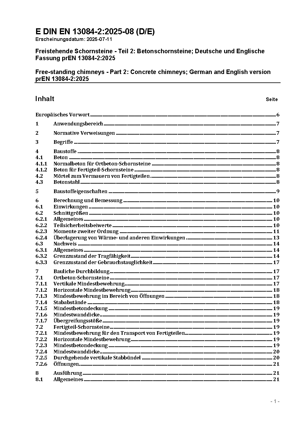 Freistehende Schornsteine - Teil 2: Betonschornsteine; Deutsche Fassung prEN 13084-2:2004