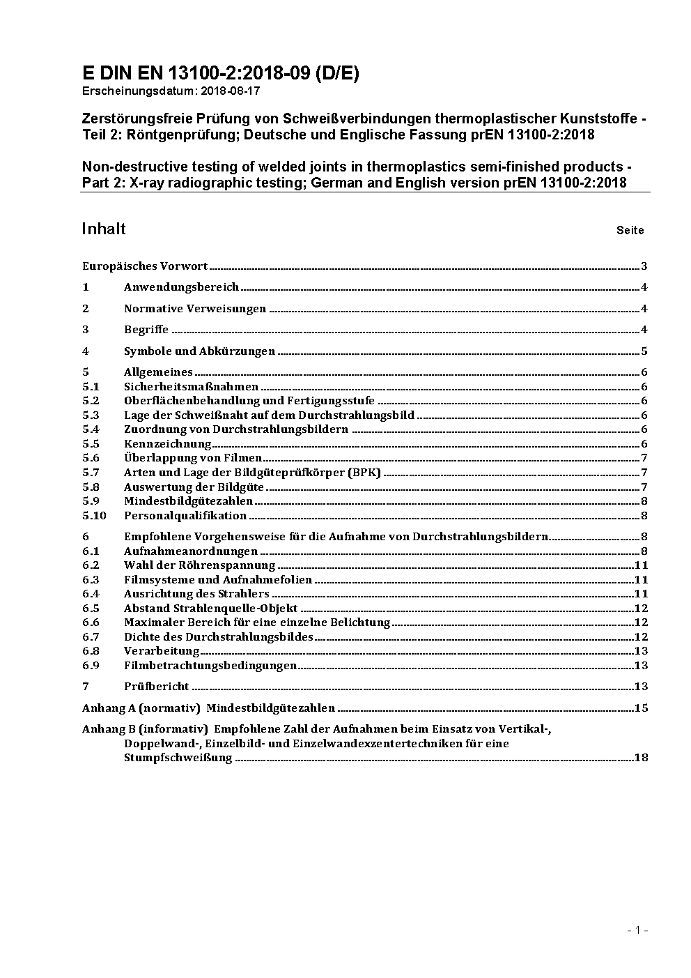 Zerstörungsfreie Prüfung von Schweißverbindungen aus thermoplastischen Kunststoffen - Teil 2: Röntgenprüfung; Deutsche Fassung prEN 13100-2:2002