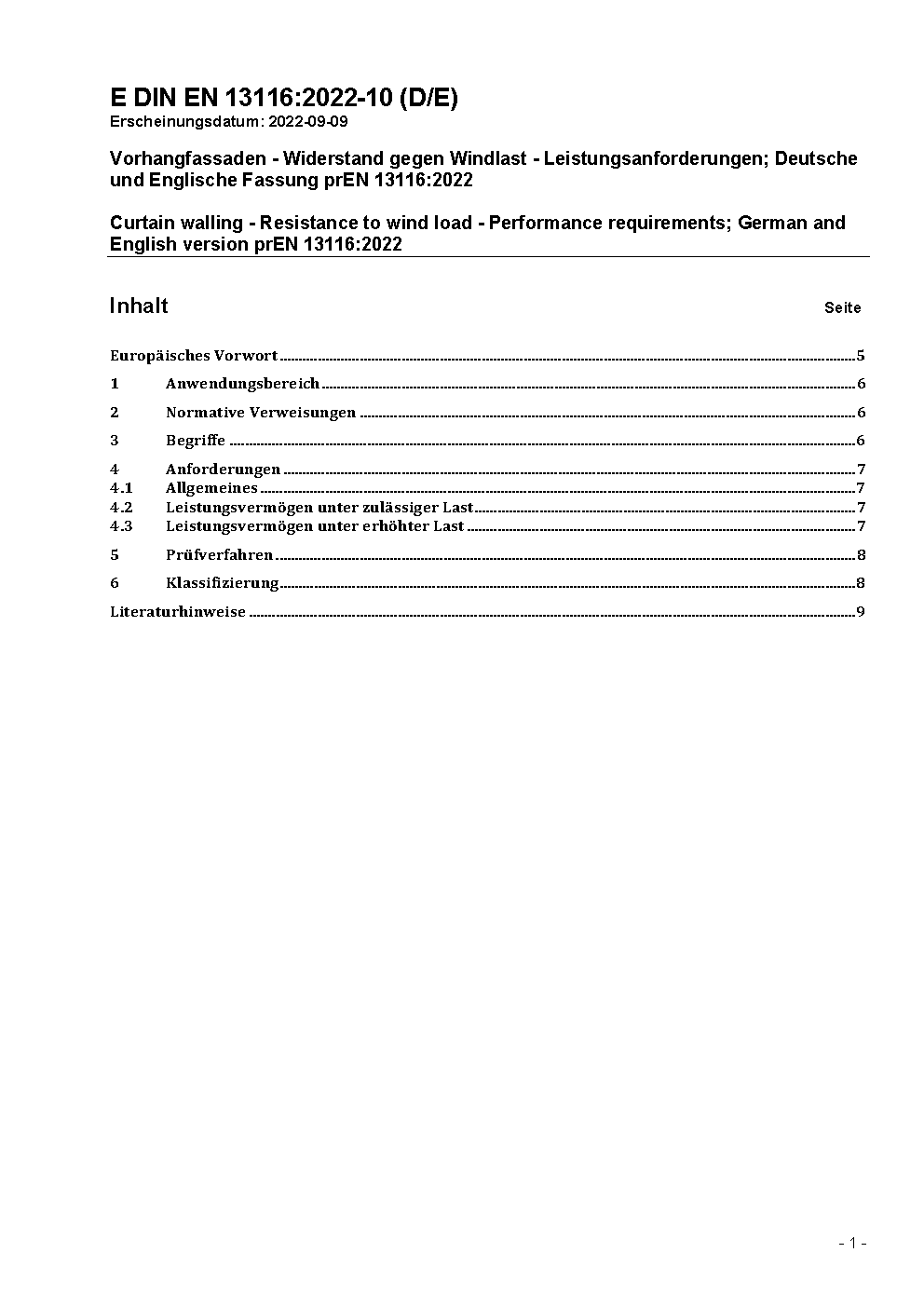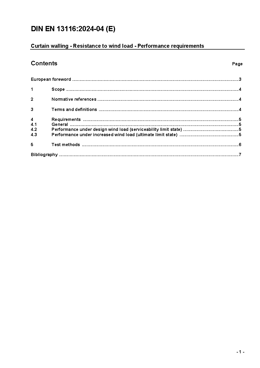 Curtain walling - Resistance to wind load - Performance requirements; German version EN 13116:2001