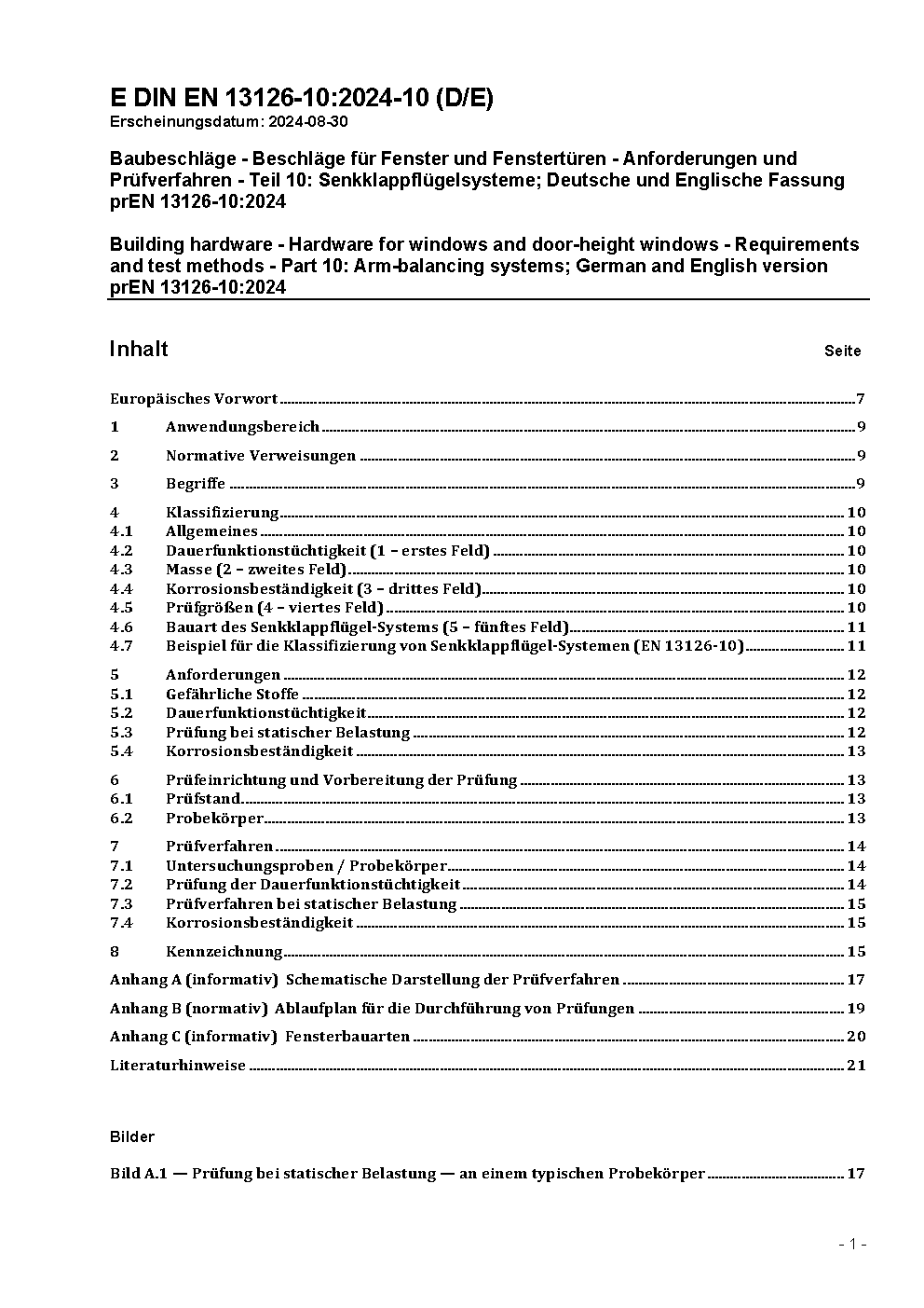 Baubeschläge - Beschläge für Fenster und Fenstertüren - Anforderungen und Prüfverfahren - Teil 10: Senkklappflügelsysteme; Deutsche Fassung EN 13126-10:2008
