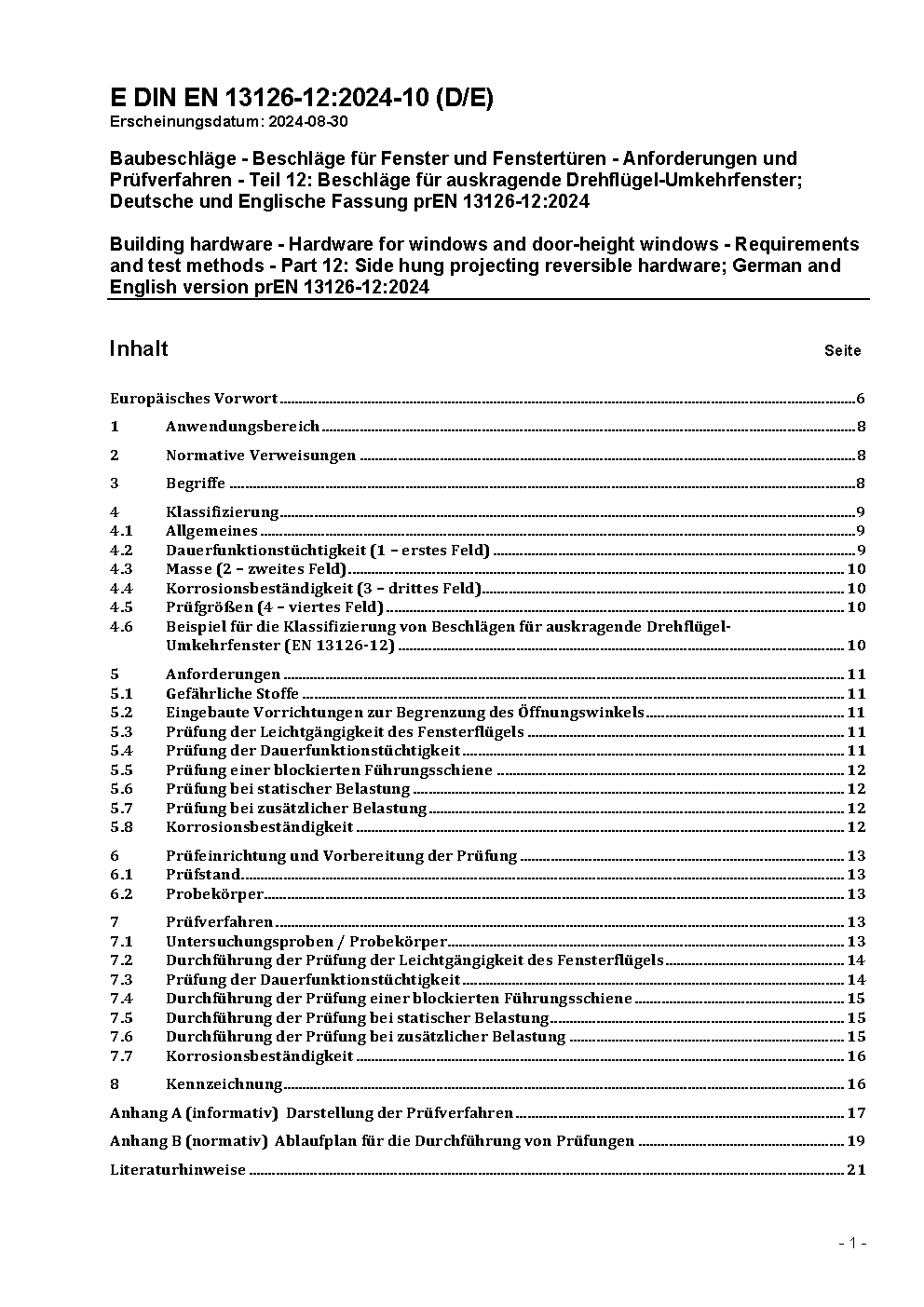 Baubeschläge - Beschläge für Fenster und Fenstertüren - Anforderungen und Prüfverfahren - Teil 12: Beschläge für auskragende Drehflügel-Umkehrfenster; Deutsche Fassung EN 13126-12:2008