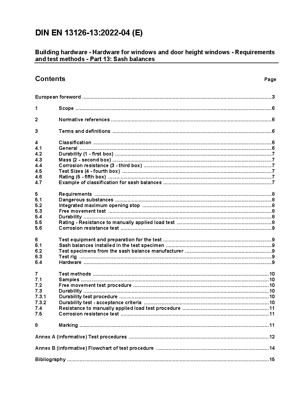 Building hardware - Hardware for windows and balcony doors - Requirements and test methods - Part 13: Sash balances; German version EN 13126-13:2012