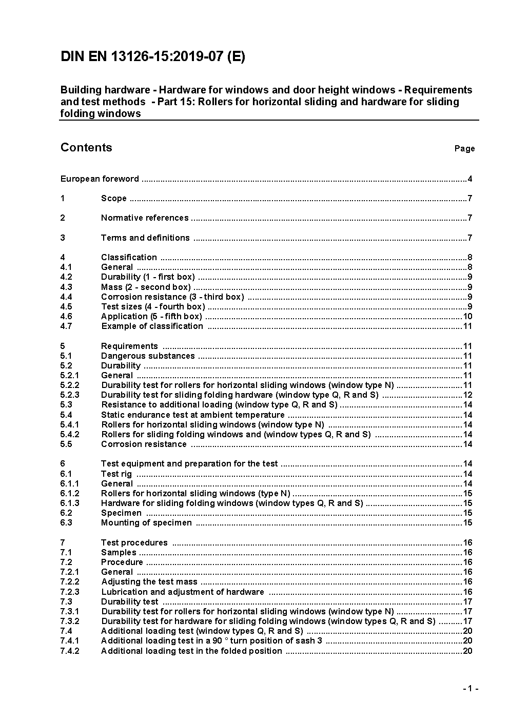 Building hardware - Hardware for windows and door height windows - Requirements and test methods - Part 15: Rollers for horizontal sliding and hardware for sliding folding windows; German and English version prEN 13126-15:2017