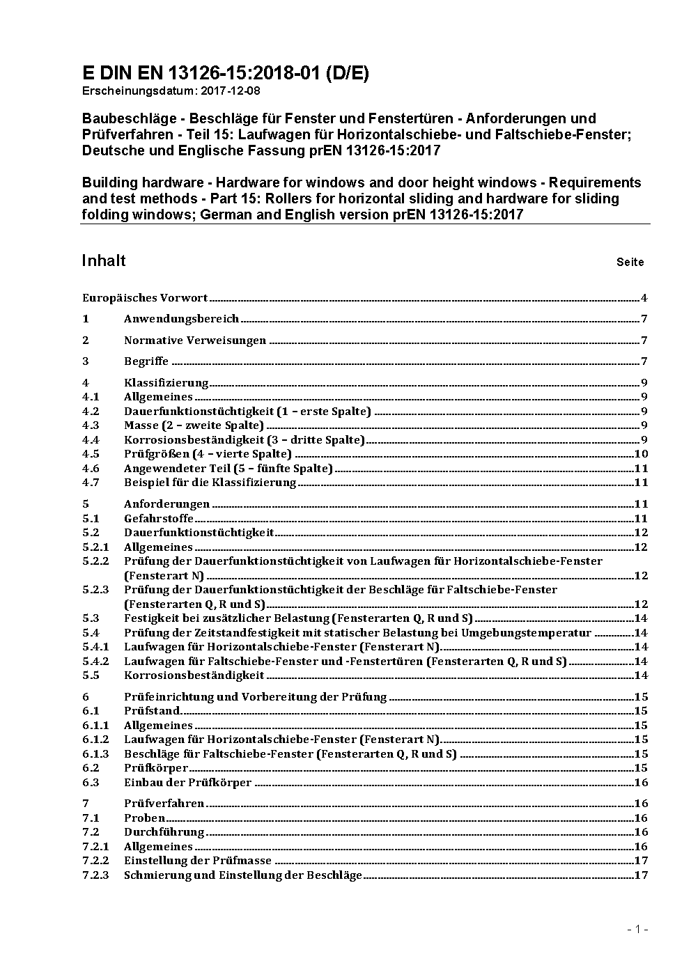 Baubeschläge - Beschläge für Fenster und Fenstertüren - Anforderungen und Prüfverfahren - Teil 15: Laufwagen für Horizontalschiebe- und Faltschiebe-Fenster; Deutsche und Englische Fassung prEN 13126-15:2017