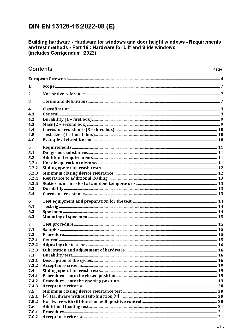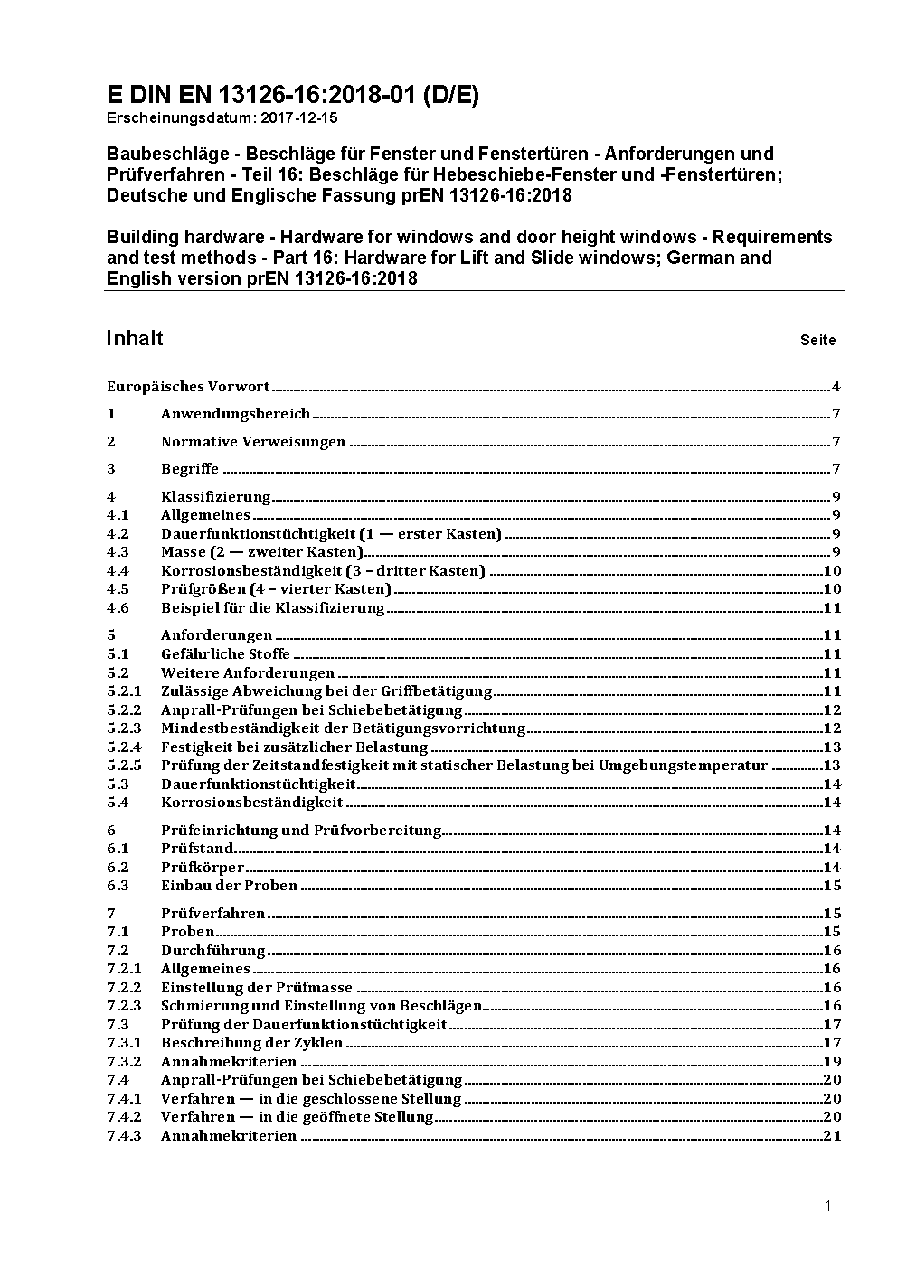 Building hardware - Requirements and test methods for windows and doors height windows - Part 16: Hardware for Lift&Slide windows and doors; German version EN 13126-16:2008