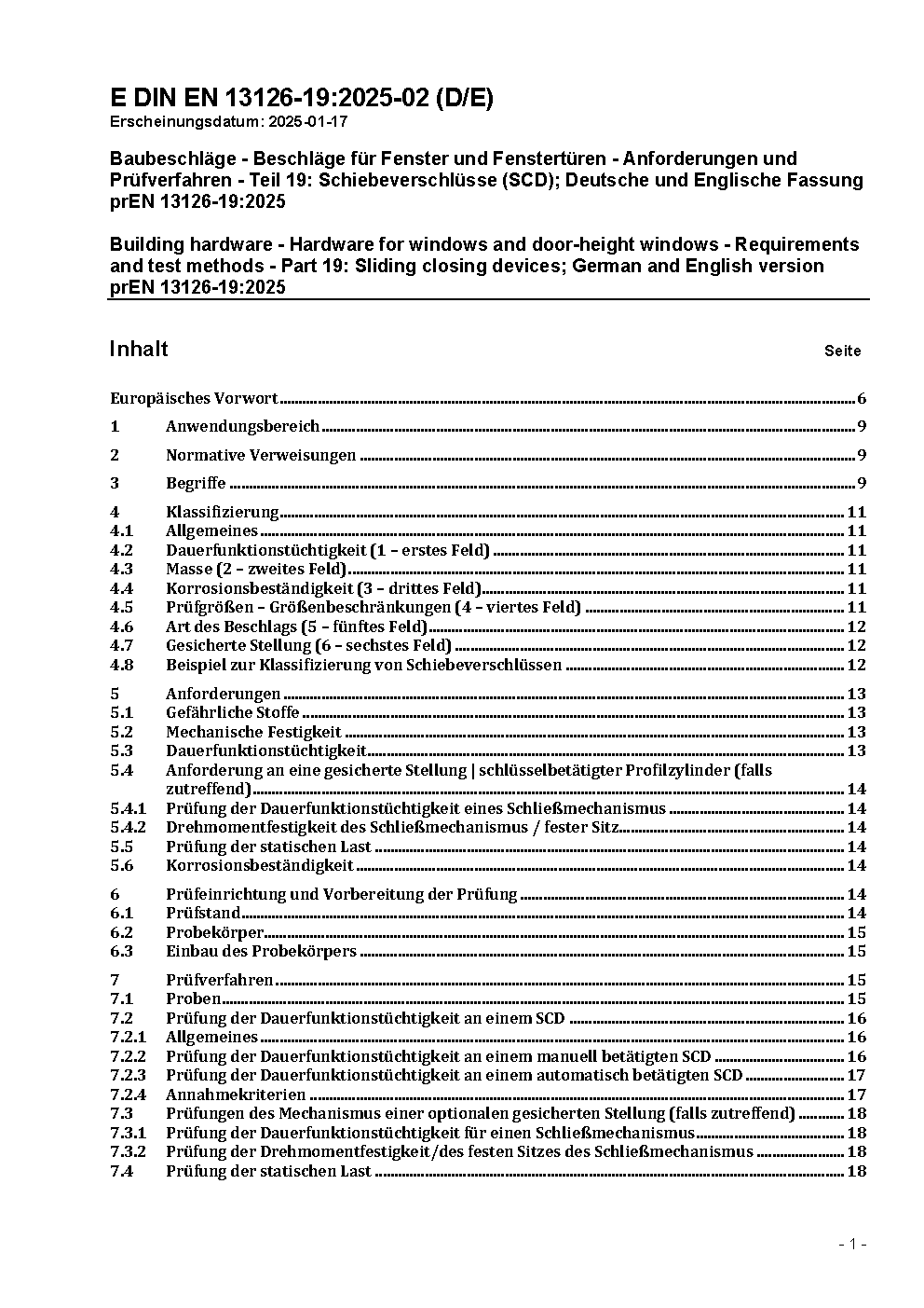 Baubeschläge - Beschläge für Fenster und Fenstertüren - Anforderungen und Prüfverfahren - Teil 19: Schiebeverschlüsse (SCD); Deutsche und Englische Fassung prEN 13126-19:2025