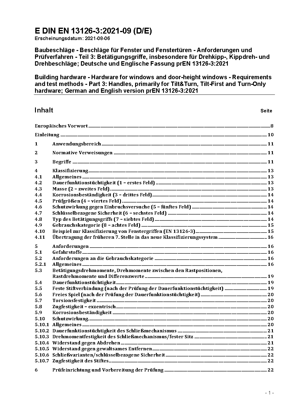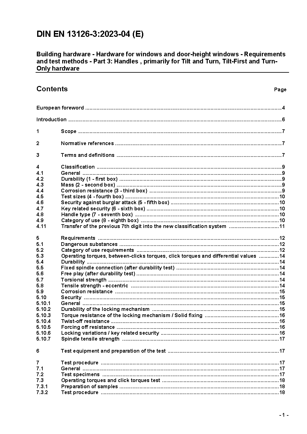 Building hardware - Hardware for windows and door height windows - Requirements and test methods - Part 3: Handles, primarily for Tilt and Turn, Tilt-First and Turn-Only hardware; German version EN 13126-3:2011