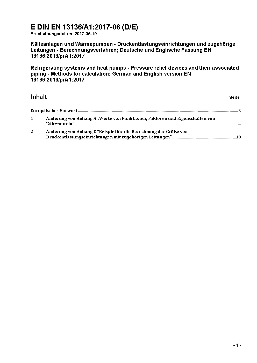 Kälteanlagen und Wärmepumpen - Druckentlastungseinrichtungen und zugehörige Leitungen - Berechnungsverfahren; Deutsche und Englische Fassung EN 13136:2013/prA1:2017