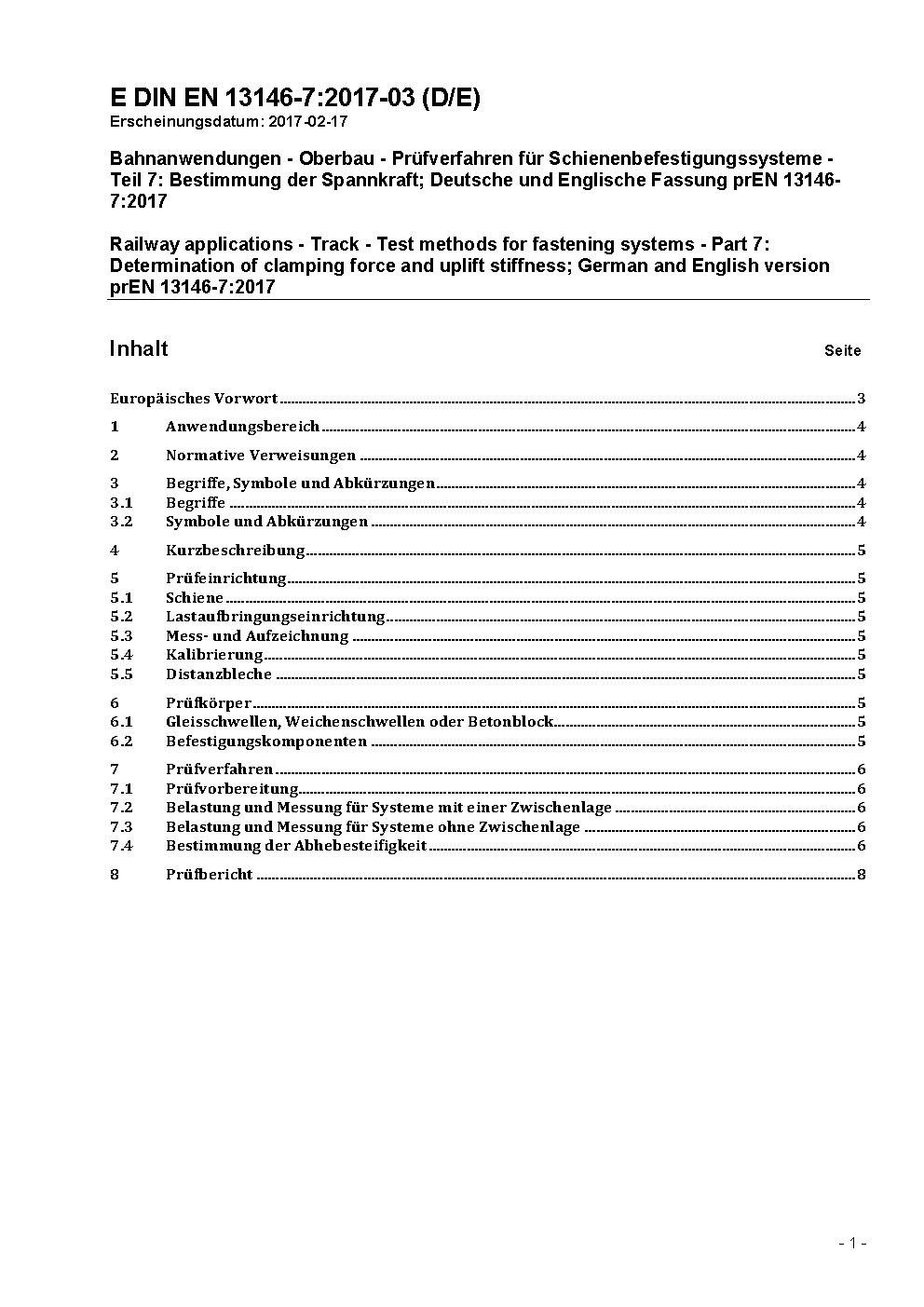 Bahnanwendungen - Oberbau; Prüfverfahren für Befestigungssysteme - Teil 7: Bestimmung der Spannkraft; Deutsche Fassung prEN 13146-7:1998