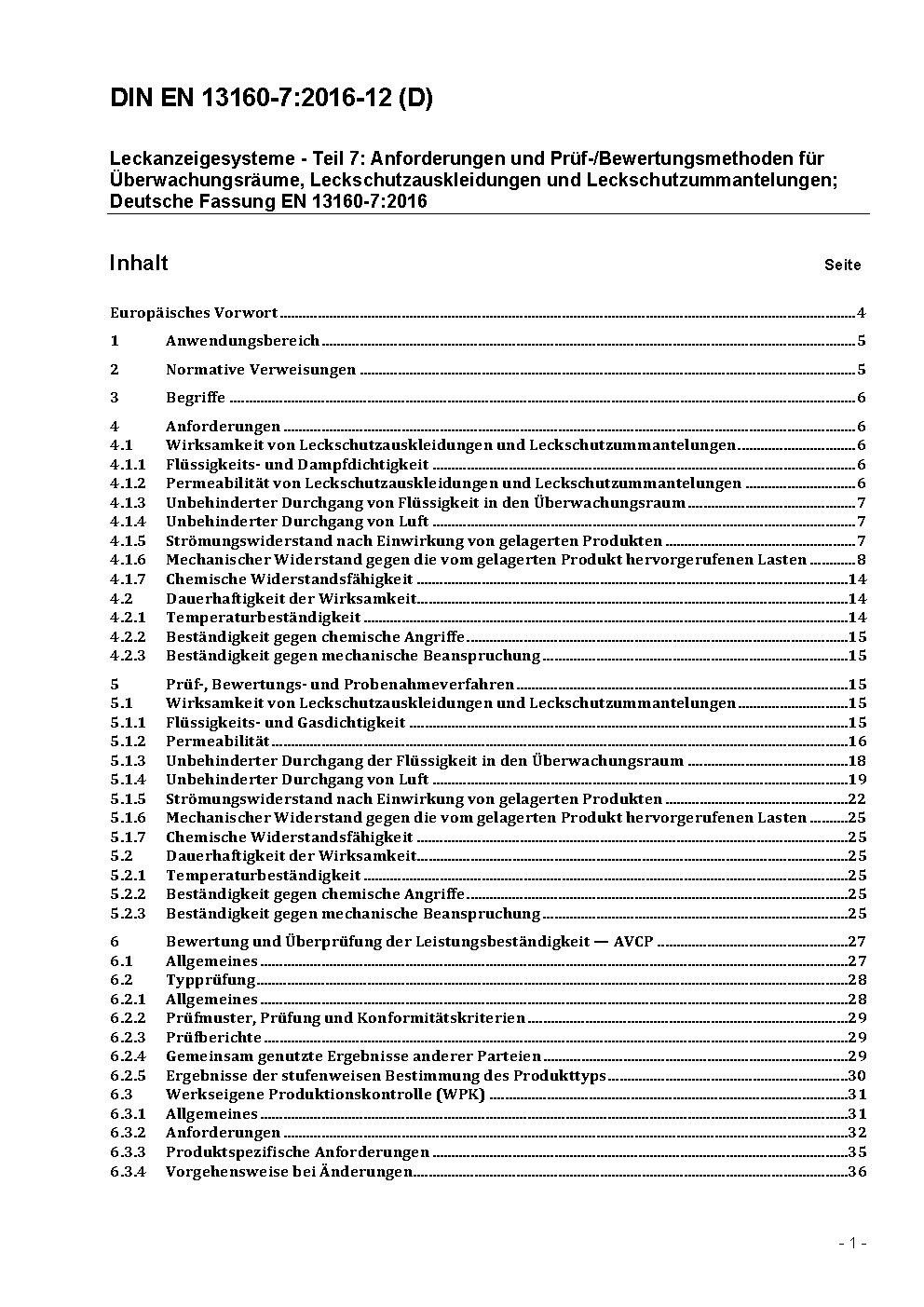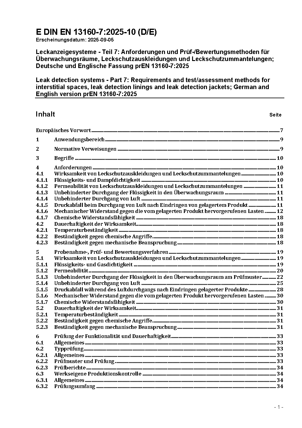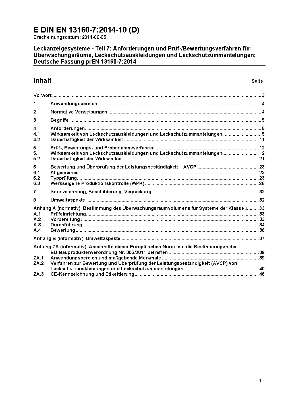 Leckanzeigesysteme - Teil 7: Allgemeine Anforderungen und Prüfverfahren für Überwachungsräume, Leckschutzauskleidungen und Leckschutzummantelungen; Deutsche Fassung EN 13160-7:2003