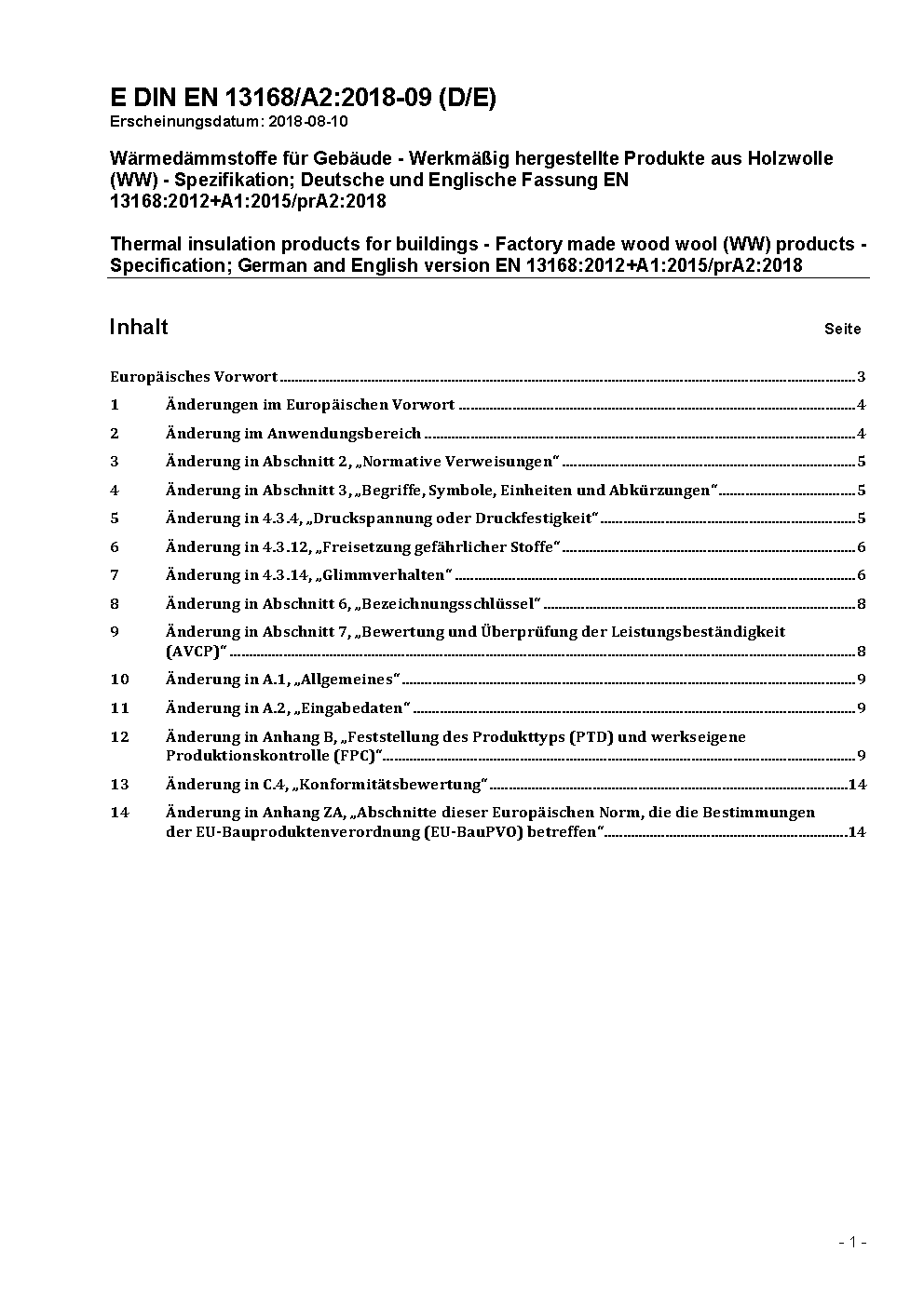 Wärmedämmstoffe für Gebäude - Werkmäßig hergestellte Produkte aus Holzwolle (WW) - Spezifikation; Deutsche Fassung EN 13168:2012/FprA1:2014