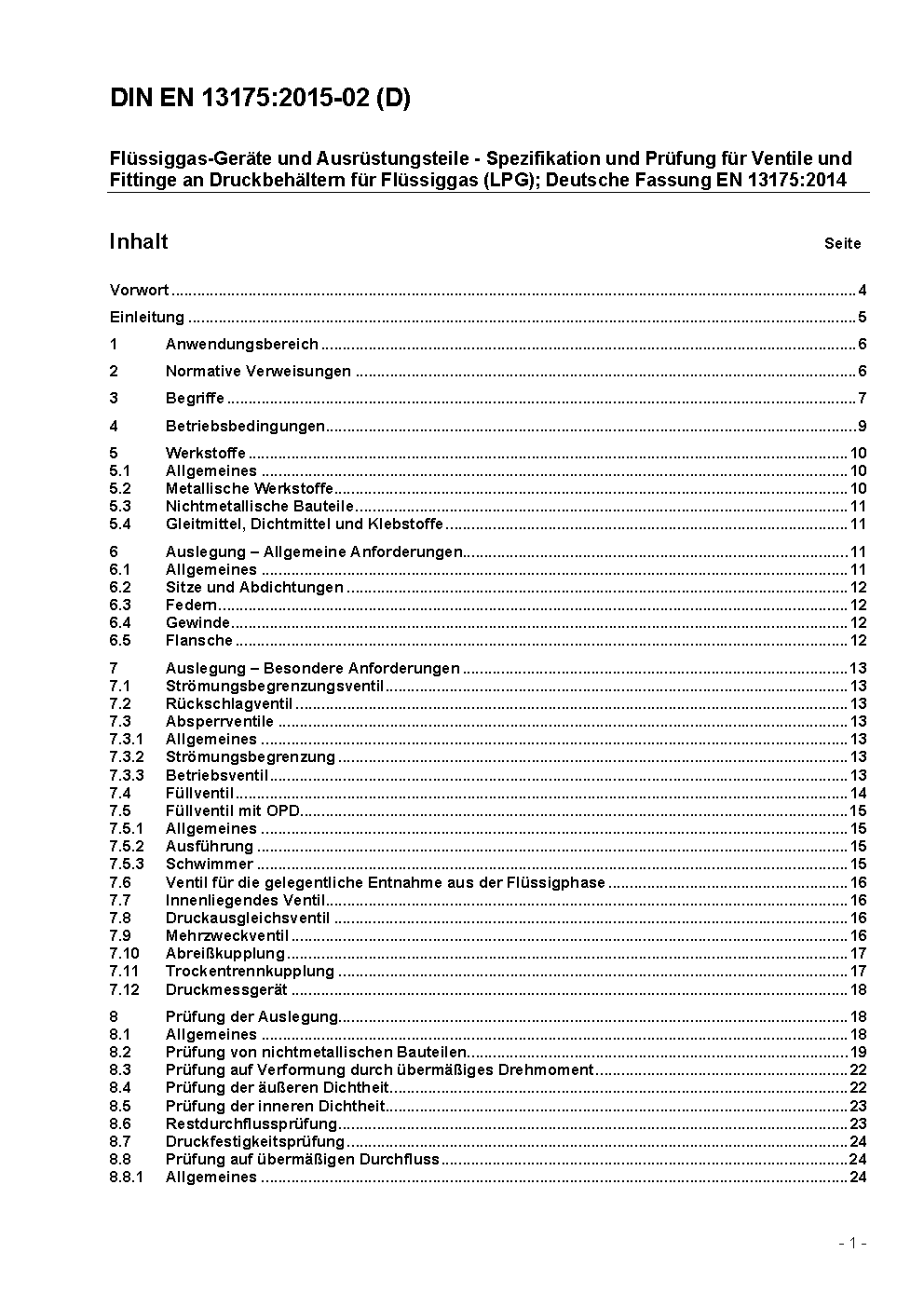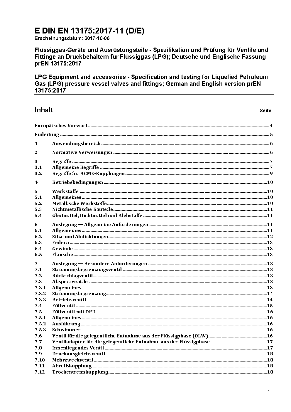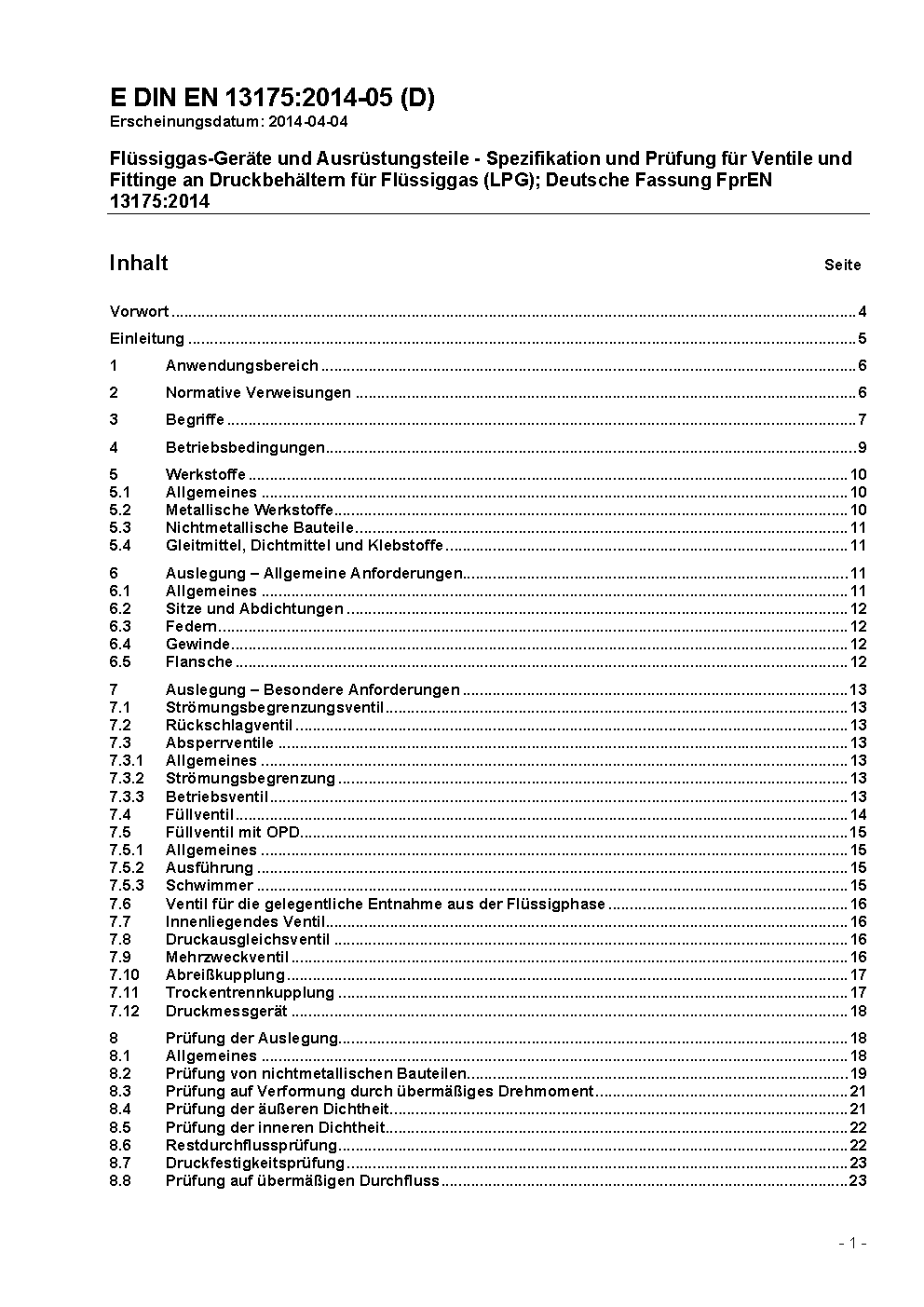 Flüssiggas-Geräte und Ausrüstungsteile - Spezifikation und Prüfung für Ventile und Fittinge an Druckbehältern für Flüssiggas (LPG); Deutsche Fassung FprEN 13175:2014