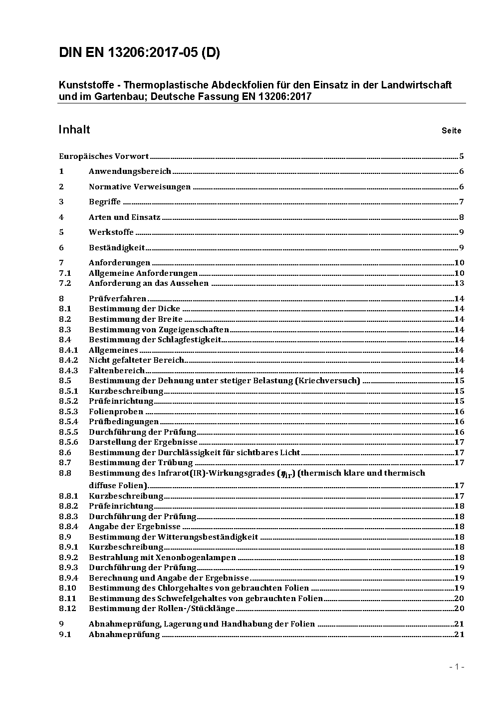 Kunststoffe - Thermoplastische Abdeckfolien für den Einsatz in der Landwirtschaft und im Gartenbau; Deutsche Fassung EN 13206:2017+A1:2020