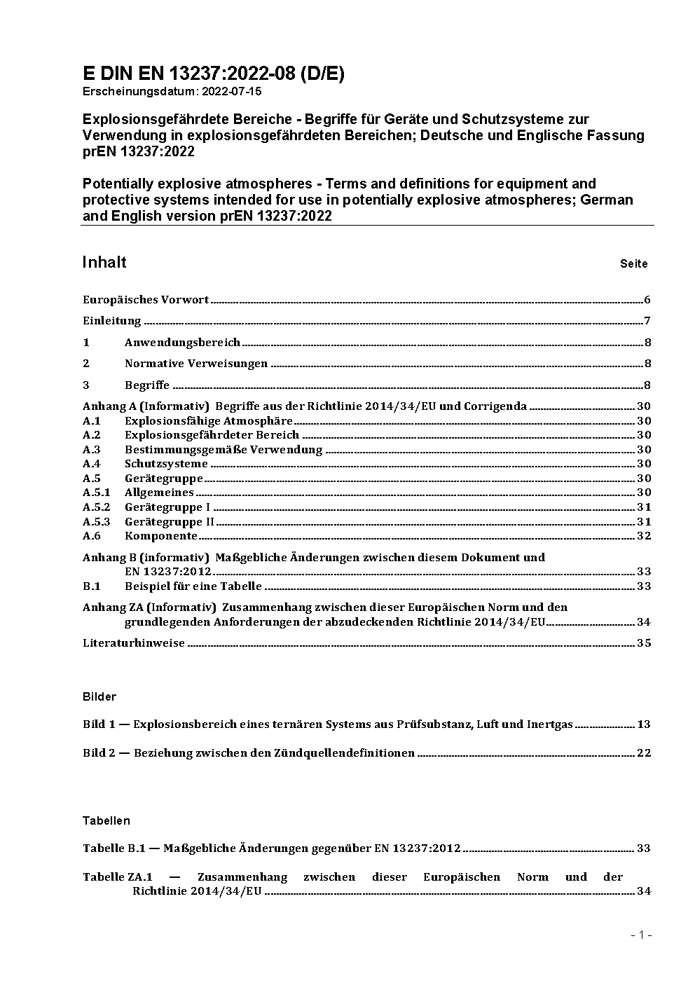 Explosionsgefährdete Bereiche - Begriffe für Geräte und Schutzsysteme zur Verwendung in explosionsgefährdeten Bereichen; Deutsche und Englische Fassung prEN 13237:2022