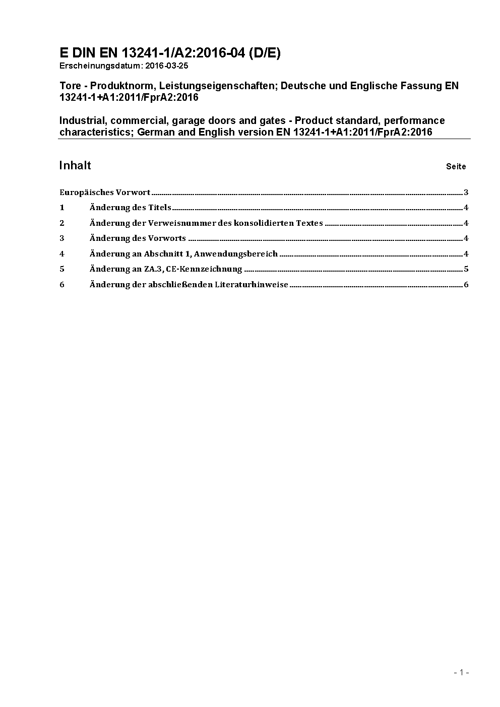 Tore - Produktnorm, Leistungseigenschaften; Deutsche und Englische Fassung EN 13241-1+A1:2011/FprA2:2016