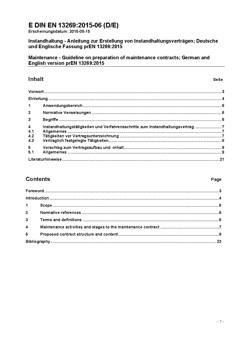 Instandhaltung - Anleitung zur Erstellung von Instandhaltungsverträgen; Deutsche Fassung EN 13269:2016
