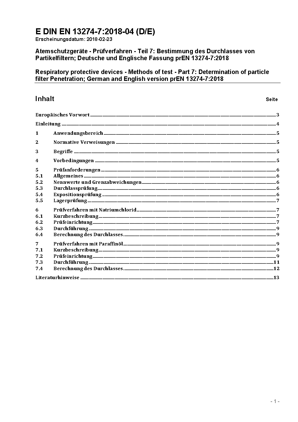 Atemschutzgeräte - Prüfverfahren - Teil 7: Bestimmung des Durchlasses von Partikelfiltern; Deutsche Fassung prEN 13274-7:1999