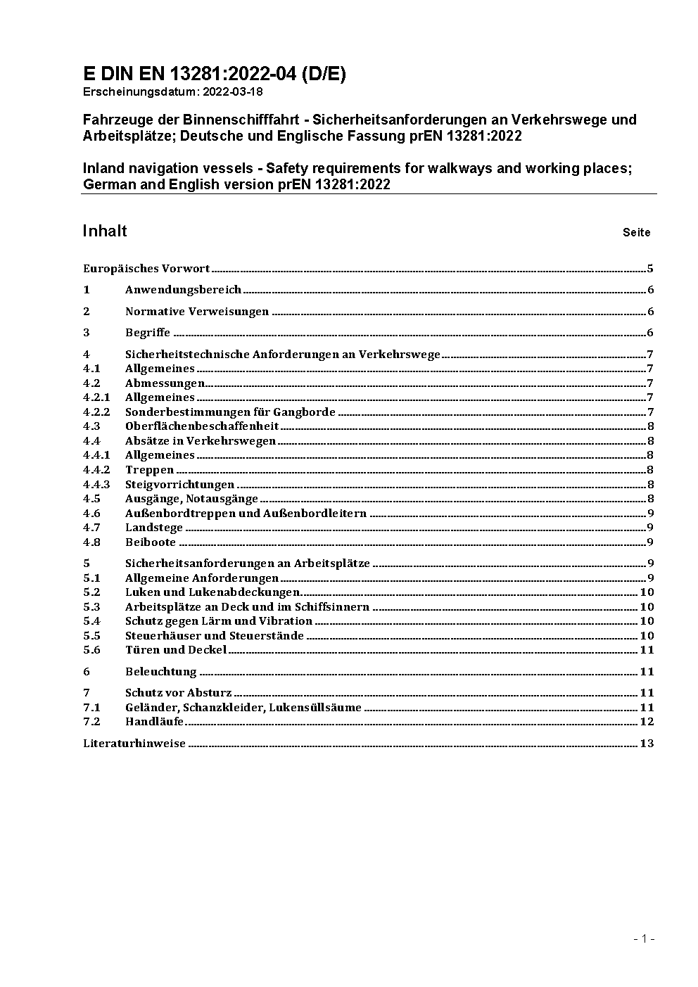 Fahrzeuge der Binnenschifffahrt - Sicherheitsanforderungen an Verkehrswege und Arbeitsplätze; Deutsche Fassung EN 13281:2000