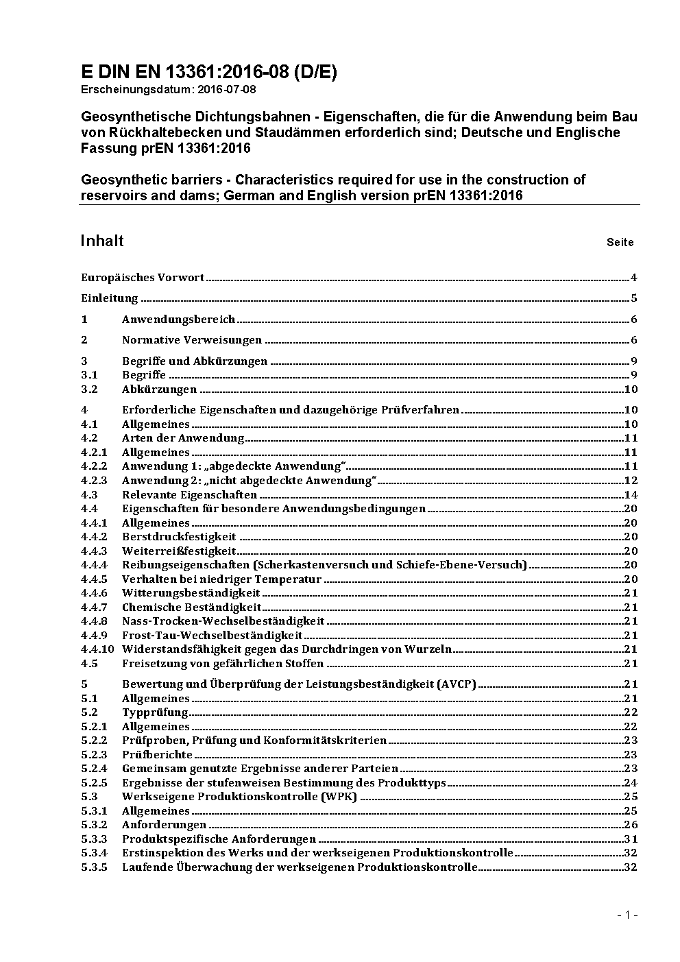 Geosynthetische Dichtungsbahnen - Eigenschaften, die für die Anwendung beim Bau von Rückhaltebecken und Staudämmen erforderlich sind; Deutsche Fassung EN 13361:2018