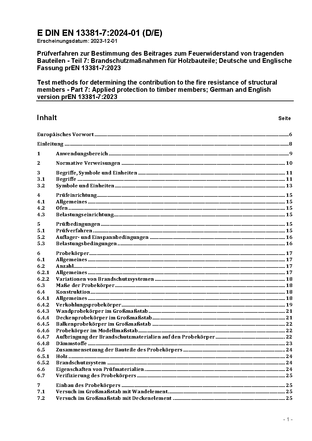 Prüfverfahren zur Bestimmung des Beitrages zum Feuerwiderstand von tragenden Bauteilen - Teil 7: Brandschutzmaßnahmen für Holzbauteile; Deutsche Fassung prEN 13381-7:2008